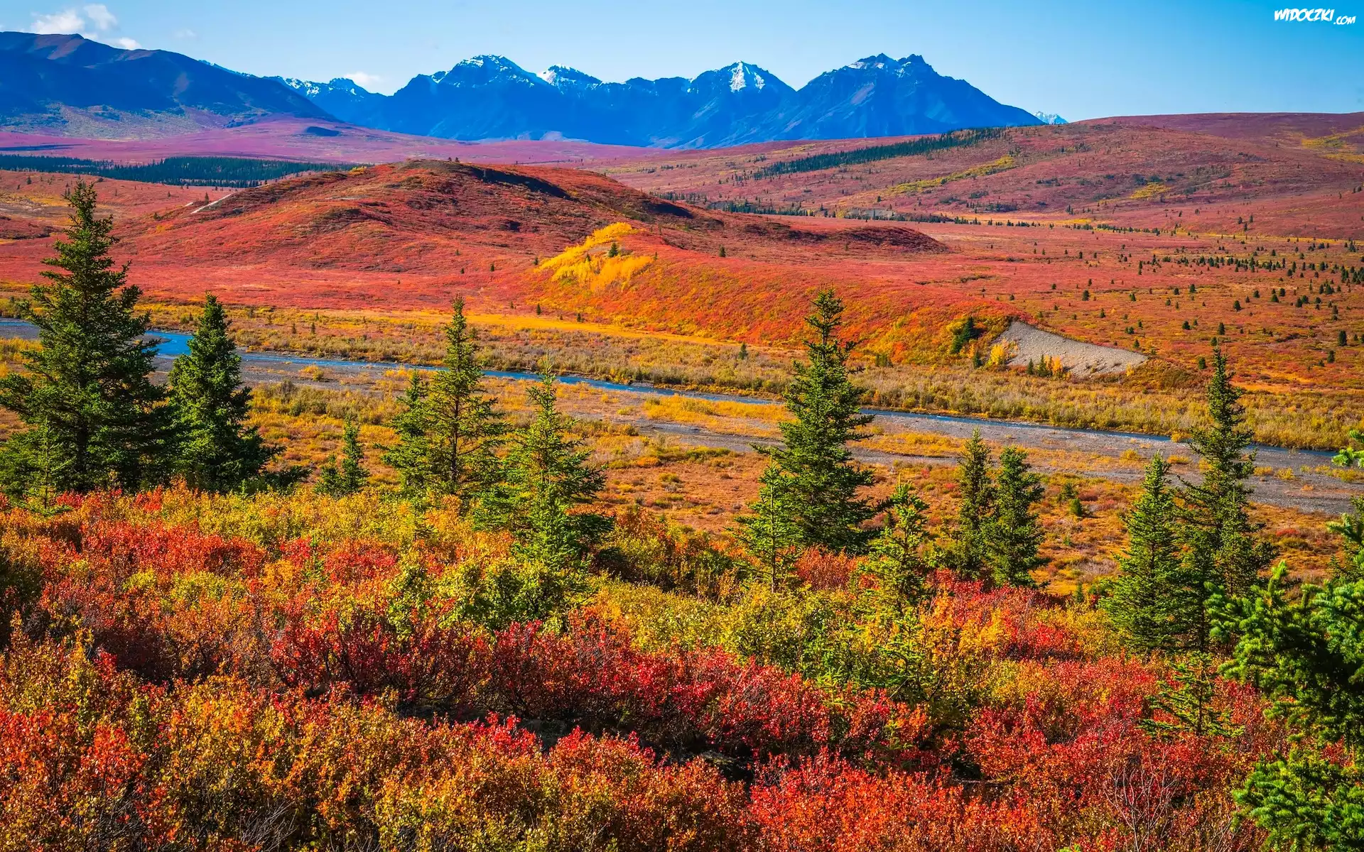 Stany Zjednoczone, Alaska, Park Narodowy Denali, Góry, Jesień, Drzewa, Droga
