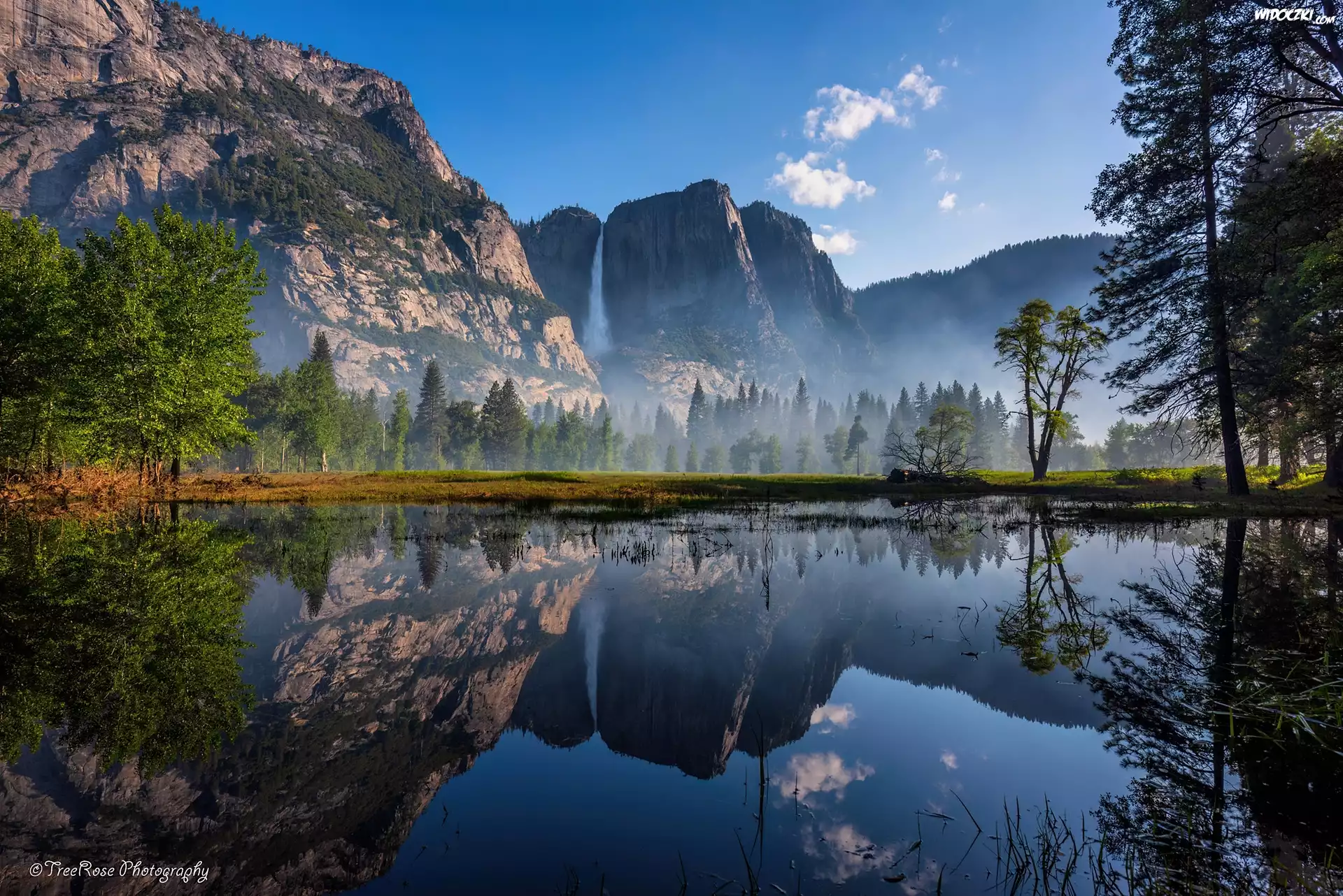Zdjęcia, Stany Zjednoczone, Kalifornia, Park Narodowy Yosemite, Góry, Rzeka, Drzewa, Odbicie