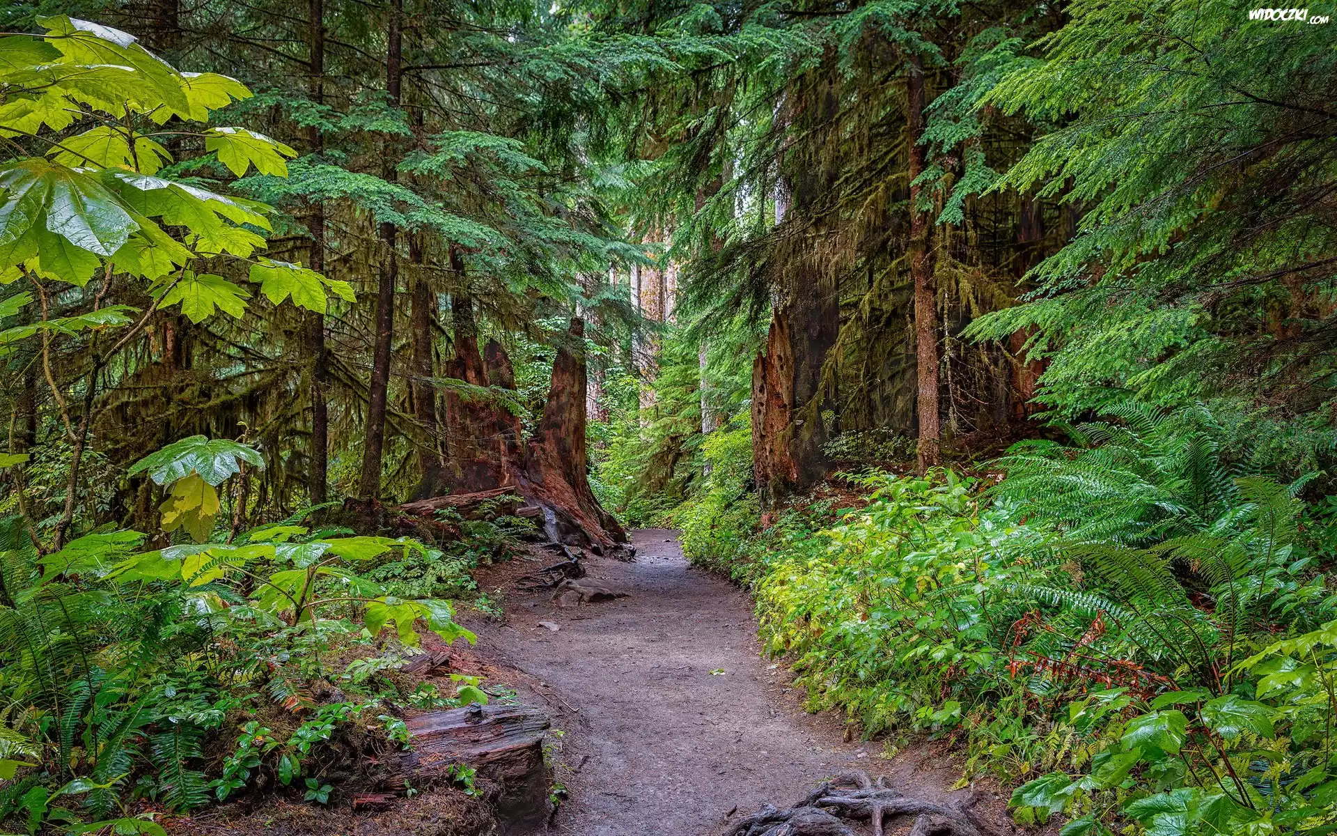 Zdjęcia, Stany Zjednoczone, Waszyngton, Park Narodowy Olympic, Drzewa, Paprocie, Ścieżka