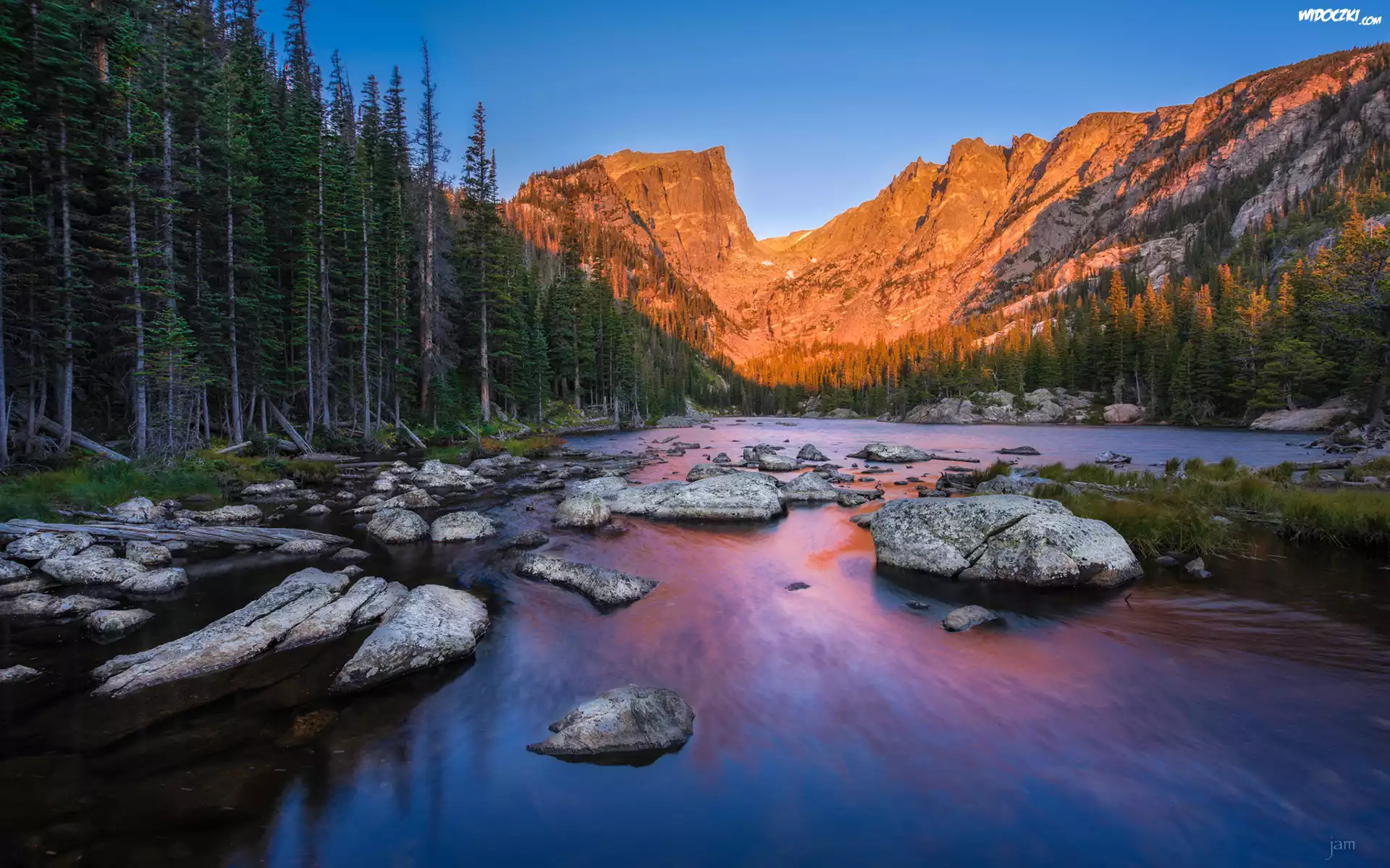 Stany Zjednoczone, Stan Kolorado, Park Narodowy Gór Skalistych, Góry, Jezioro Dream Lake, Kamienie, Drzewa, Las |