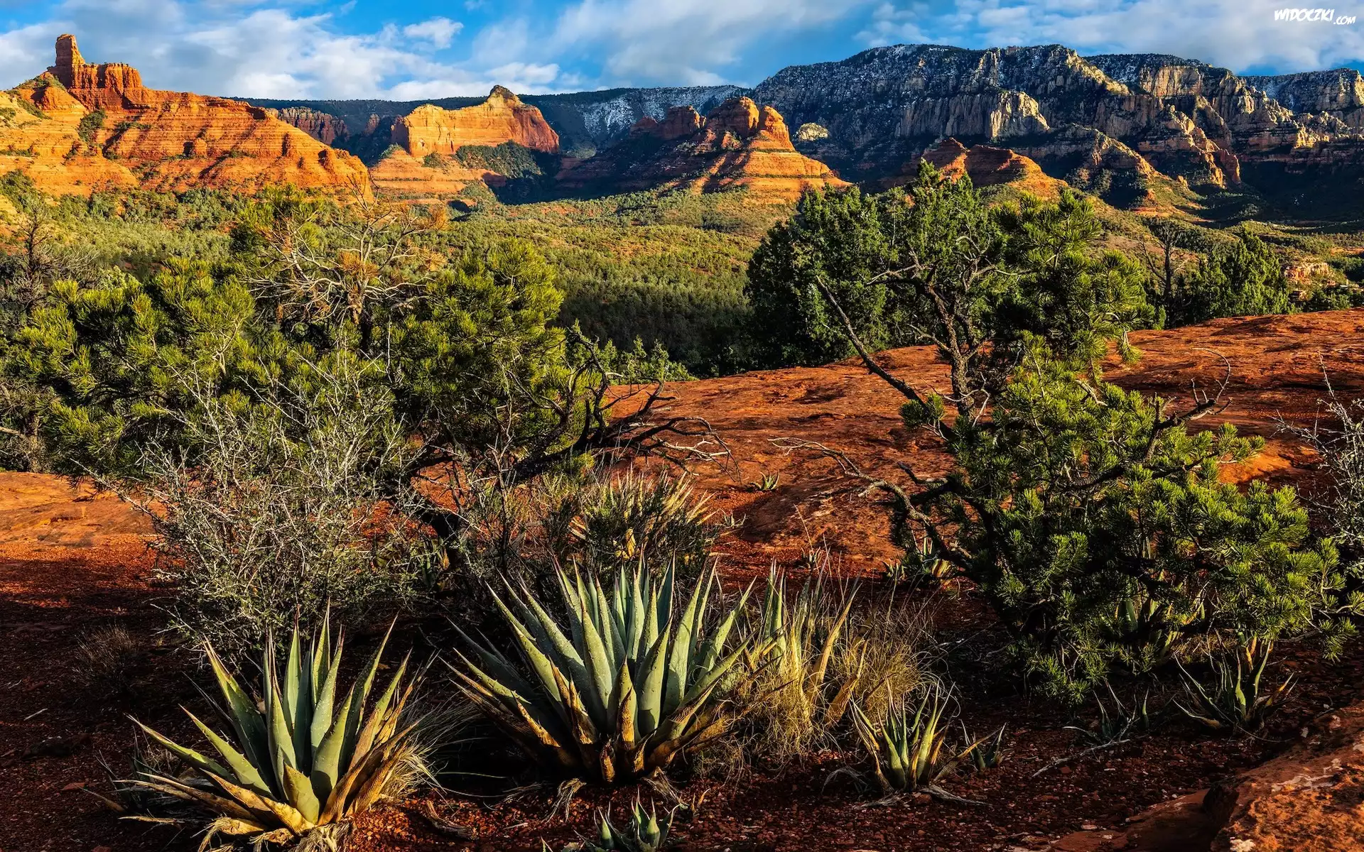 Stany Zjednoczone, Arizona, Sedona, Góry, Skały, Drzewa, Kaktusy, Rośliny
