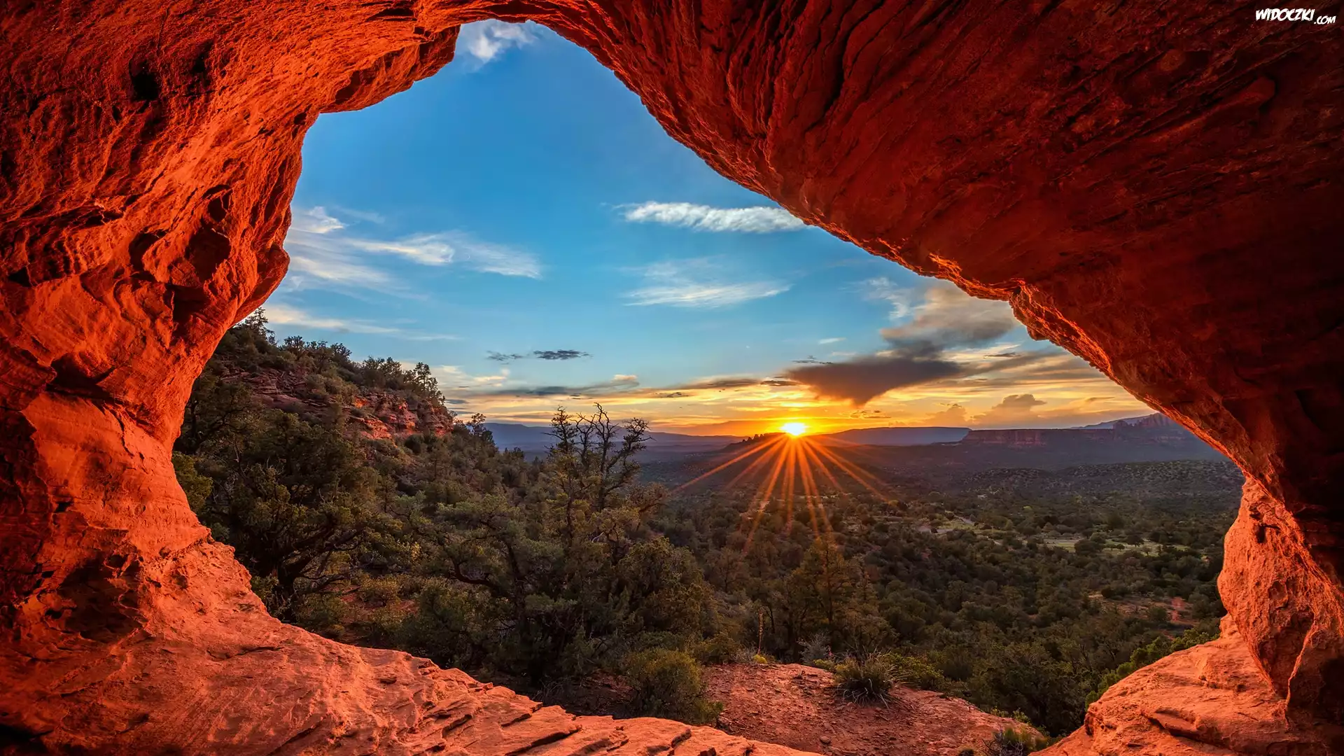 Zdjęcia, Stany Zjednoczone, Arizona, Sedona, Czerwone, Skały, Drzewa, Promienie słońca