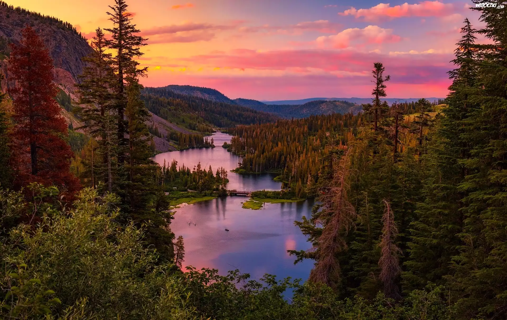 Stany Zjednoczone, Kalifornia, Hrabstwo Mono, Góry, Jeziora Twin Lakes, Jeziora Bliźniacze, Zachód słońca, Drzewa, Świerki |