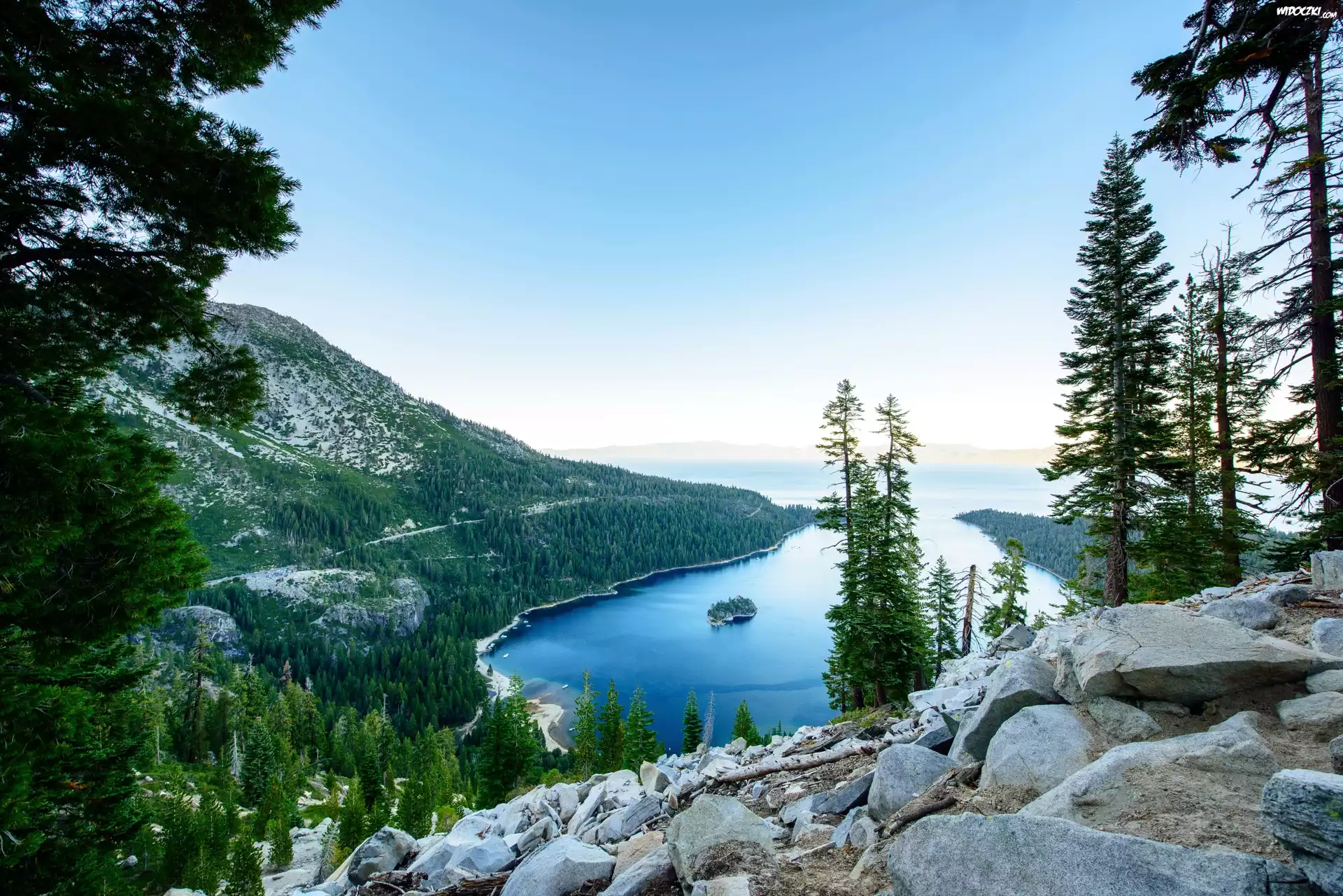 Stany Zjednoczone, Stan Kalifornia, Park stanowy Emerald Bay, Góry, Jezioro Tahoe, Las, Wyspa Fannette, Świerki |