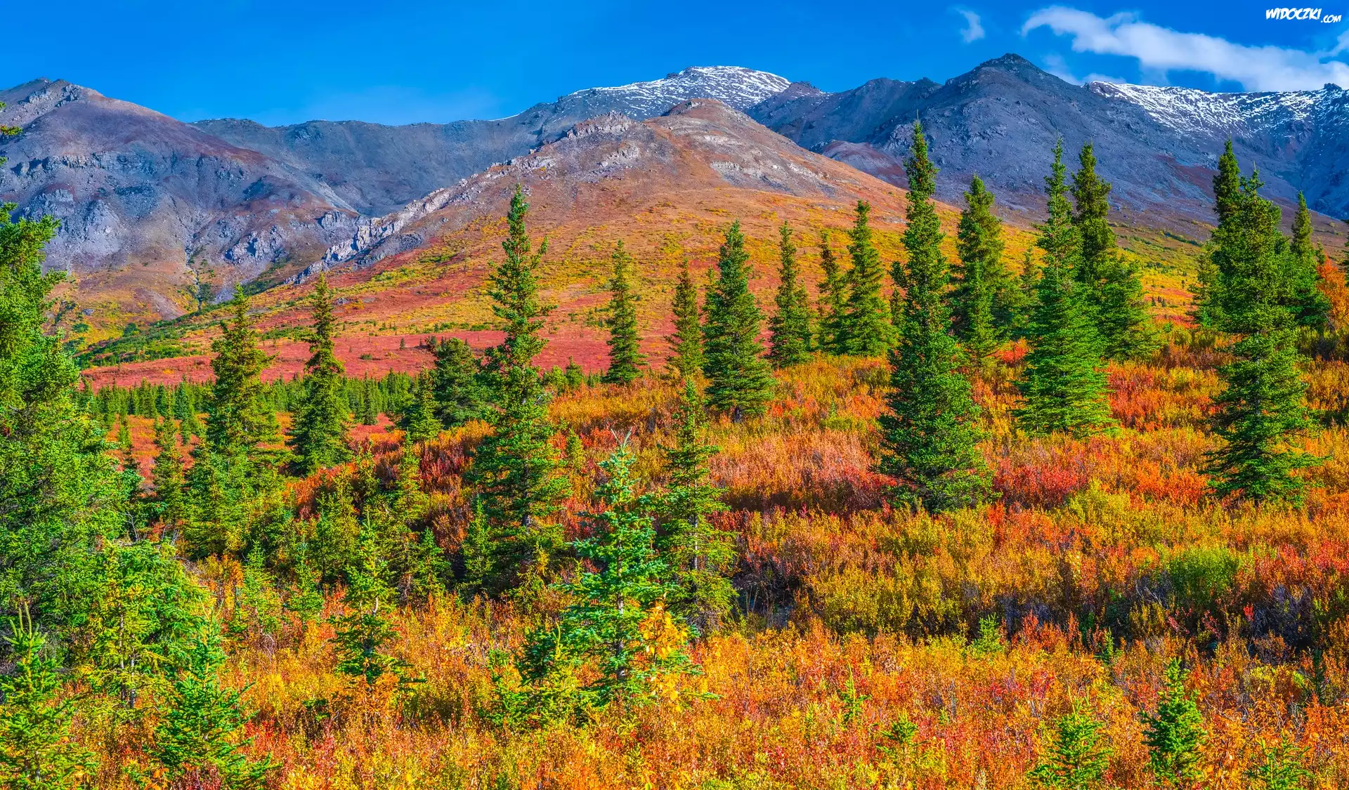 Stany Zjednoczone, Alaska, Park Narodowy Denali, Góry, Jesień, Drzewa