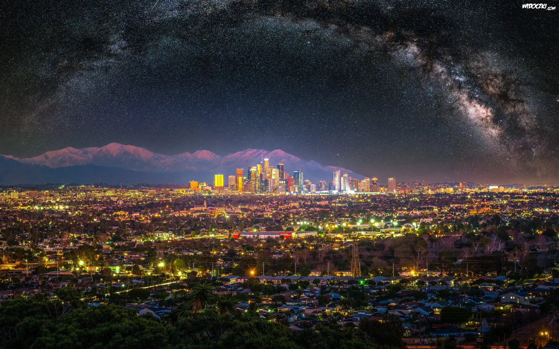 Stany Zjednoczone, Kalifornia, Los Angeles, Miasto, Domy, Wieżowce, Światła, Góry San Gabriel, Drzewa, Noc, Gwiazdy, Droga Mleczna |