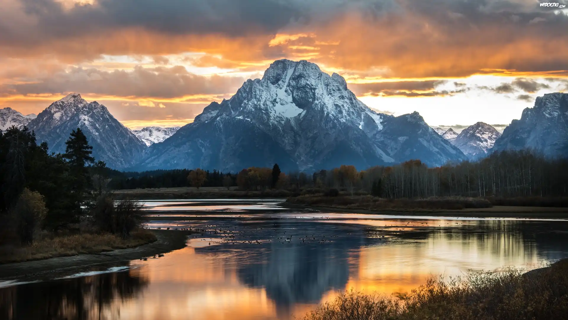 Stany Zjednoczone, Stan Wyoming, Park Narodowy Grand Teton, Góry, Szczyt Mount Moran, Drzewa, Las, Chmury, Rzeka Snake River, Odbicie |