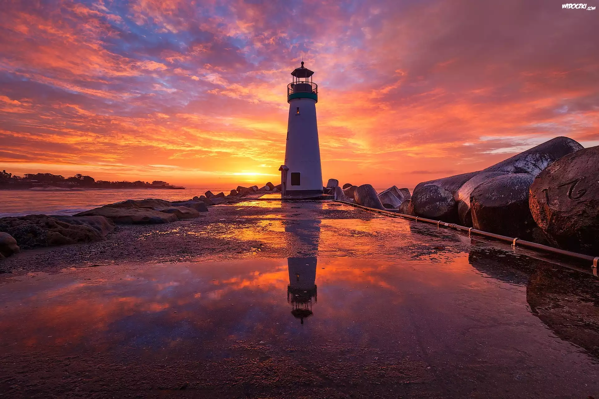 Stany Zjednoczone, Stan Kalifornia, Santa Cruz, Latarnia morska Walton Lighthouse, Wschód Słońca, Kamienie |