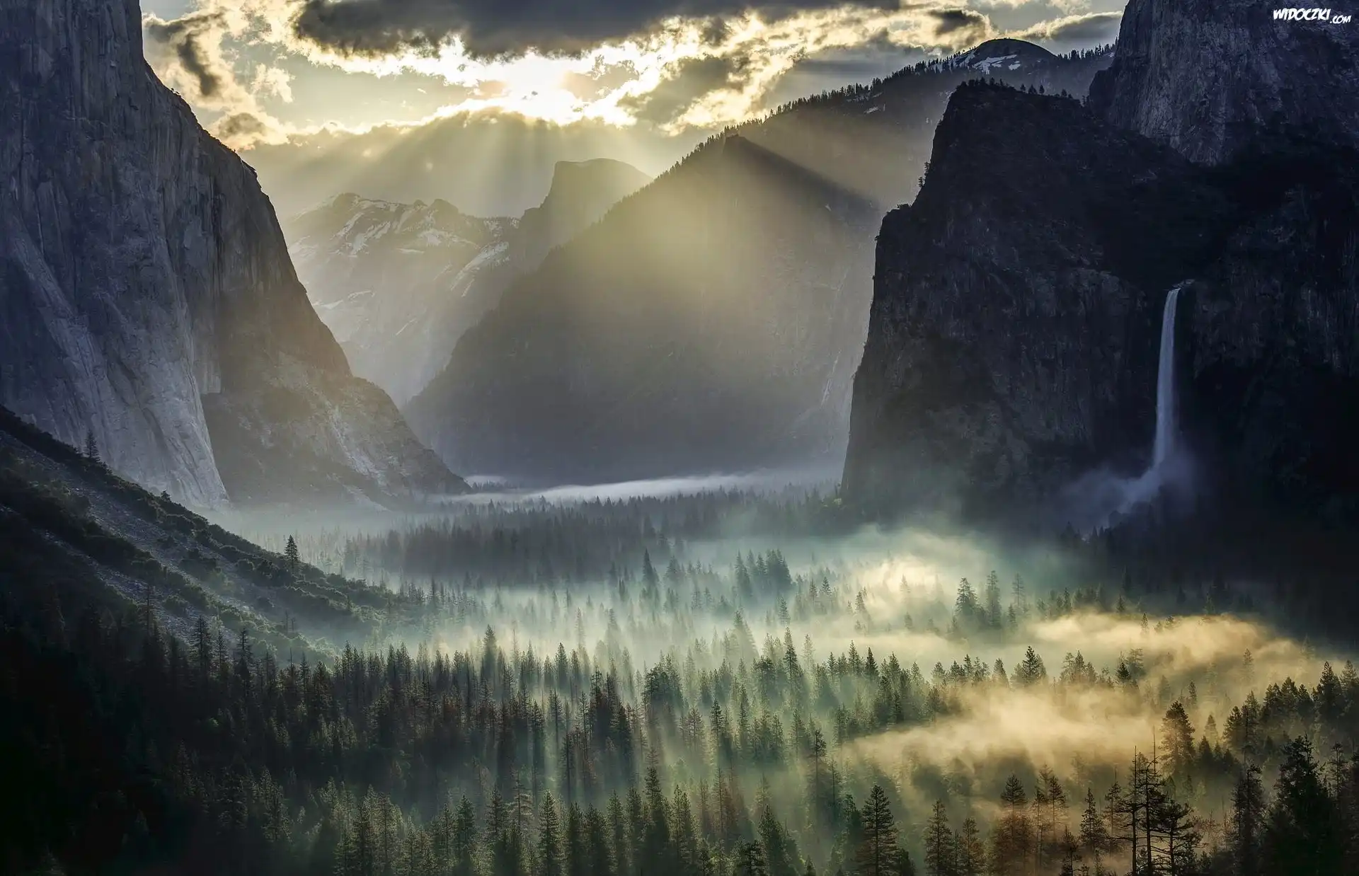 Stany Zjednoczone, Stan Kalifornia, Park Narodowy Yosemite, Góry, Las, Wodospad, Mgła, Wschód słońca |
