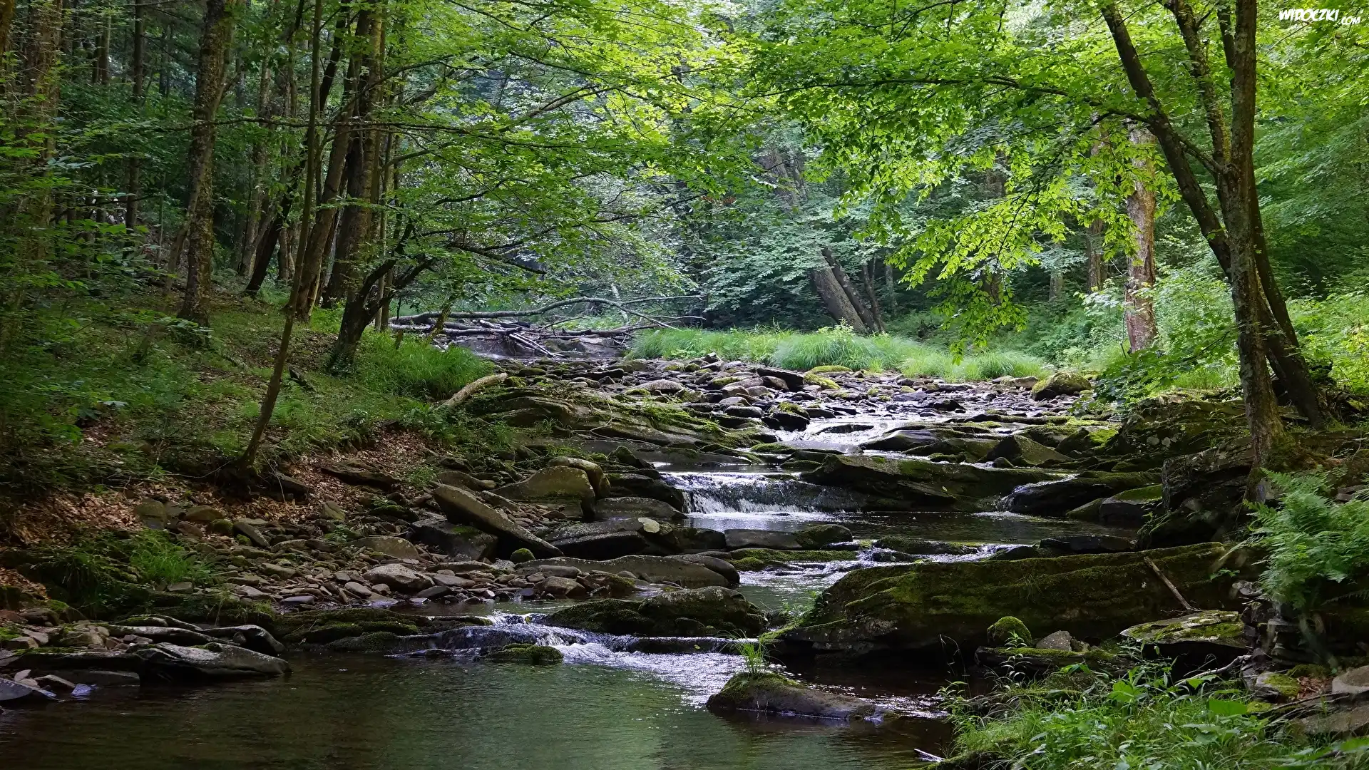 Stany Zjednoczone, Stan Wirginia Zachodnia, Rzeka, Obszar Monongahela National Forest, Las, Drzewa, Omszałe, Kamienie, Roślinność |