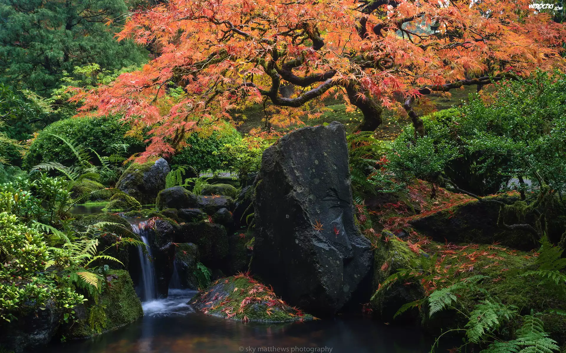 Stany Zjednoczone, Stan Oregon, Portland, Park Waszyngtona, Jesień, Ogród japoński, Drzewa, Klon palmowy, Paprocie, Kaskada, Kamienie |