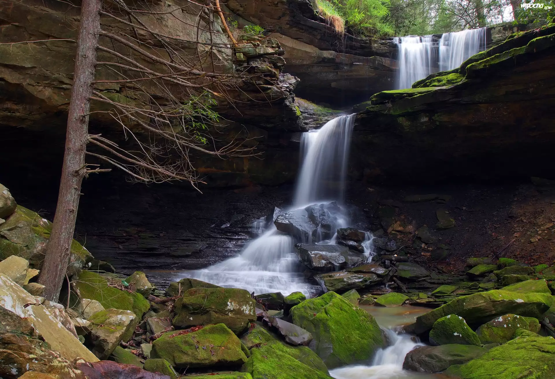 Stany Zjednoczone, Stan Kentucky, Hrabstwo Jackson, Wodospady McCammon Branch, Skały, Drzewo, Omszałe, Kamienie |