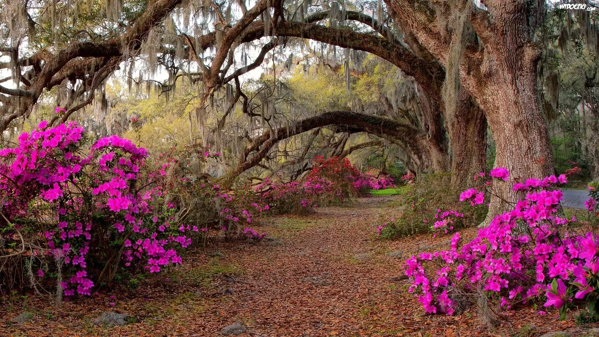 Stany Zjednoczone, Stan Karolina, Charleston, Ogród, Aleja, Drzewa, Dęby, Hiszpański mech, Oplątwa brodaczkowa, Kwiaty, Azalie |