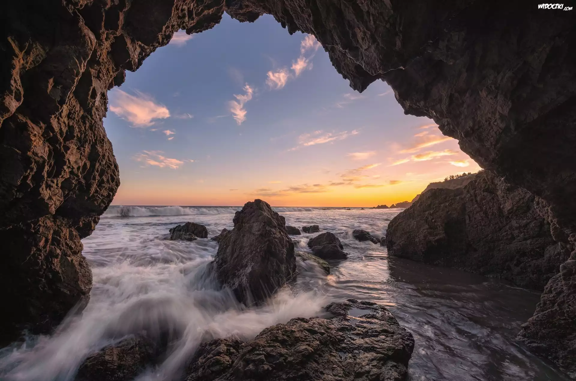 Stany Zjednoczone, Kalifornia, Malibu, Jaskinia, Skały, Plaża El Matador Beach, Morze, Zachód słońca |