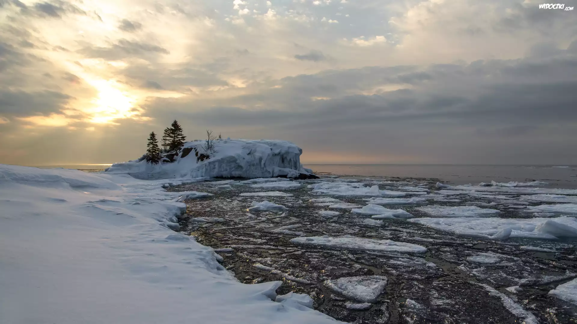 Stany Zjednoczone, Stan Minnesota, Jezioro Górne, Wysepka Hollow Rock, Zima, Śnieg, Skała, Drzewa |