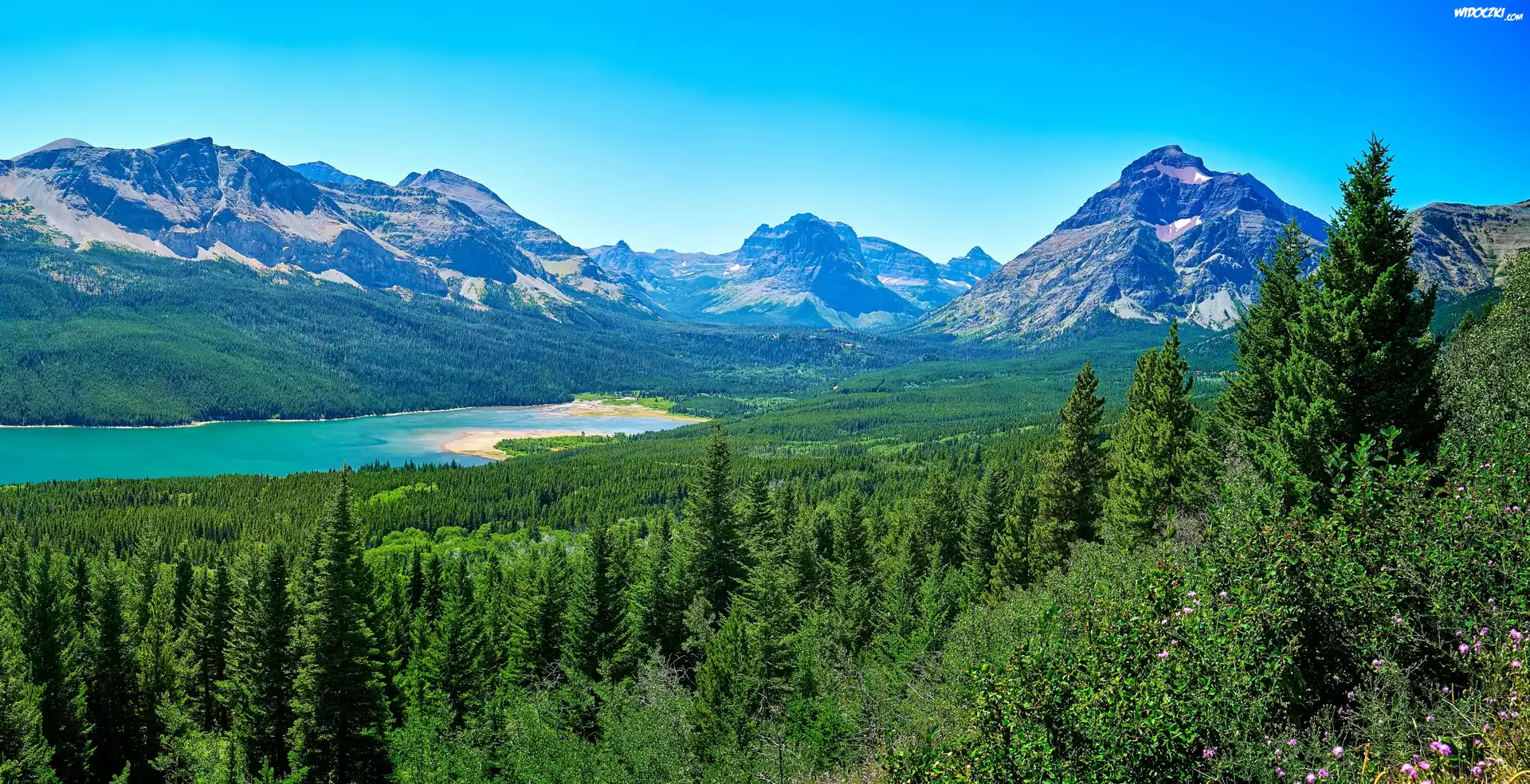 Zdjęcia, Stany Zjednoczone, Stan Montana, Park Narodowy Glacier, Góry, Jezioro Saint Mary Lake, Drzewa