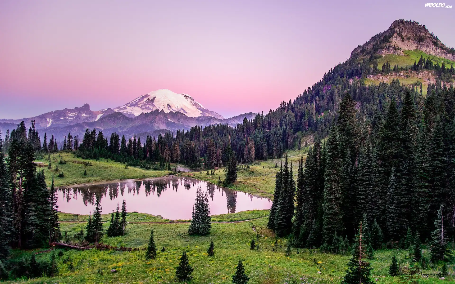 Stany Zjednoczone, Stan Waszyngton, Park Narodowy Mount Rainier, Stratowulkan Mount Rainier, Łąka, Trawa, Staw, Drzewa, Świerki, Góry |