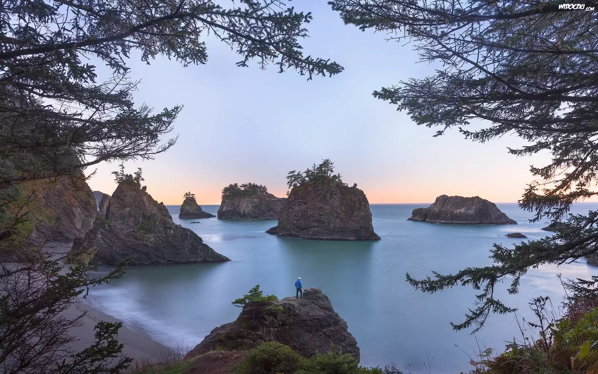 Stany Zjednoczone, Stan Oregon, Plaża, Secret Beach, Morze, Skały, Drzewa, Gałęzie, Wybrzeże, Człowiek |