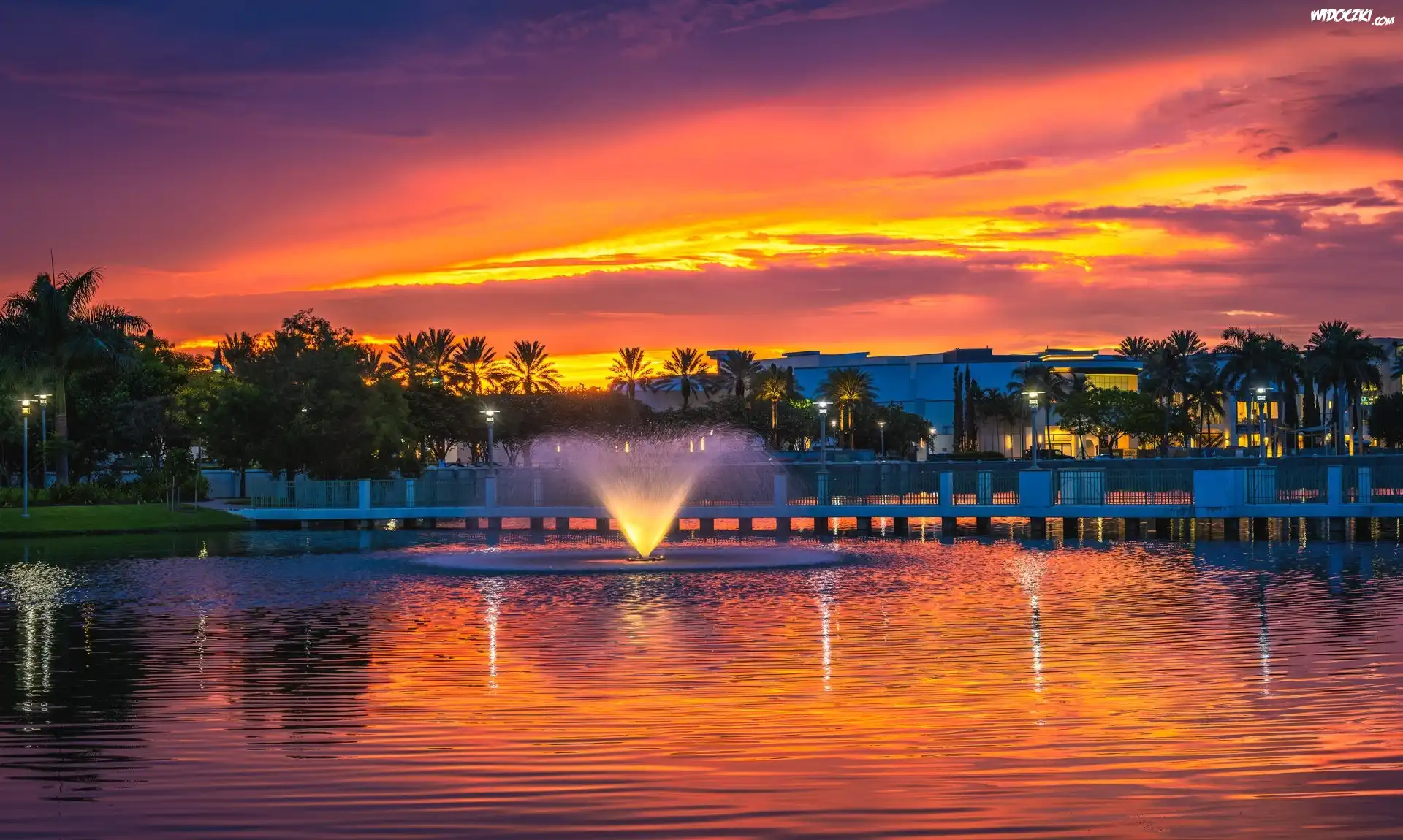 Zdjęcia, Stany Zjednoczone, Palm Beach Gardens, Fontanna, Palmy, Zachód słońca