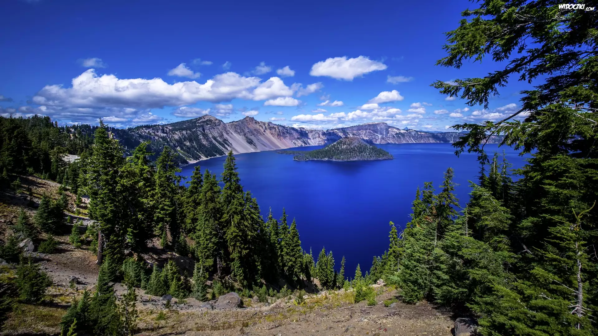 Stany Zjednoczone, Oregon, Park Narodowy Jeziora Kraterowego, Jezioro Kraterowe, Wyspa Czarodzieja, Góry, Drzewa |