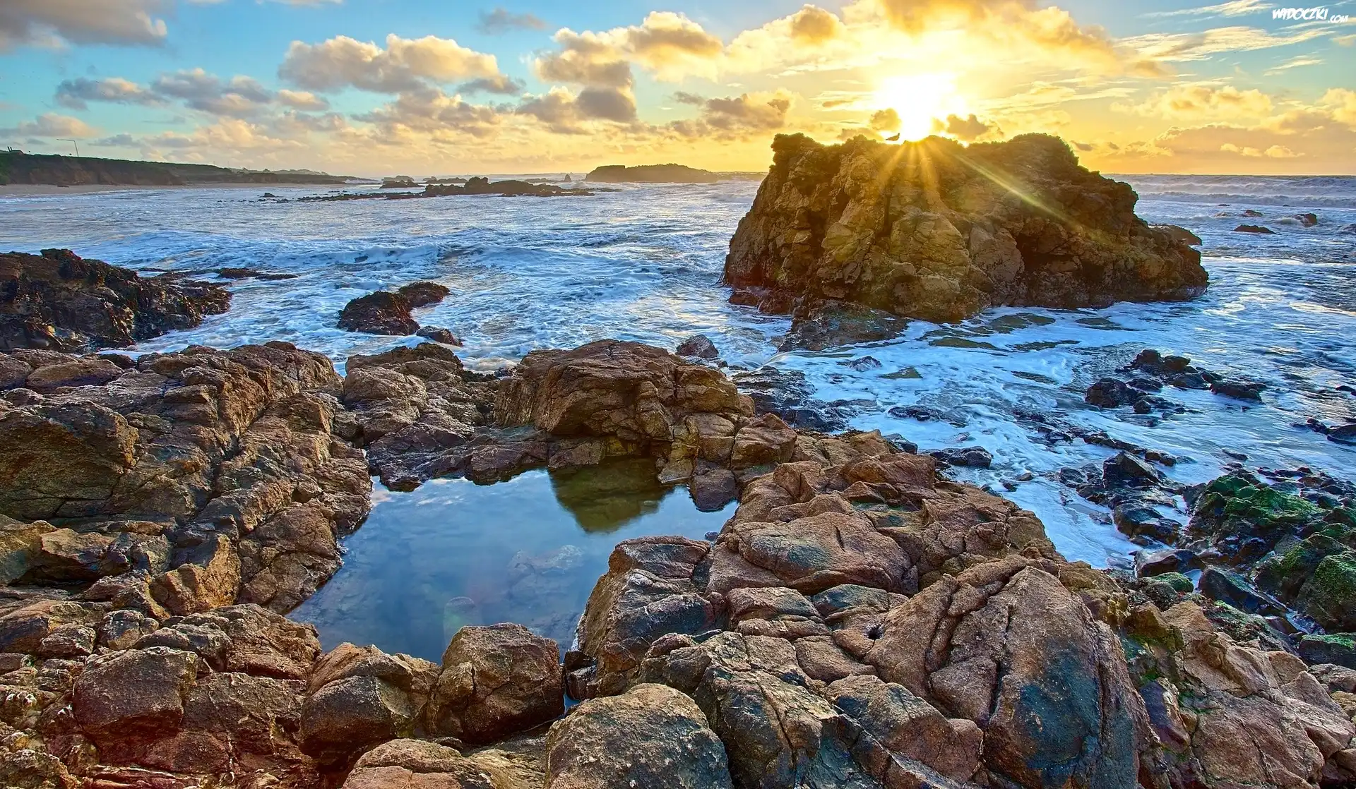 Stany Zjednoczone, Kalifornia, Plaża stanowa Pescadero - Pescadero State Beach, Zachód Słońca, Morze, Skały, Promienie słońca |