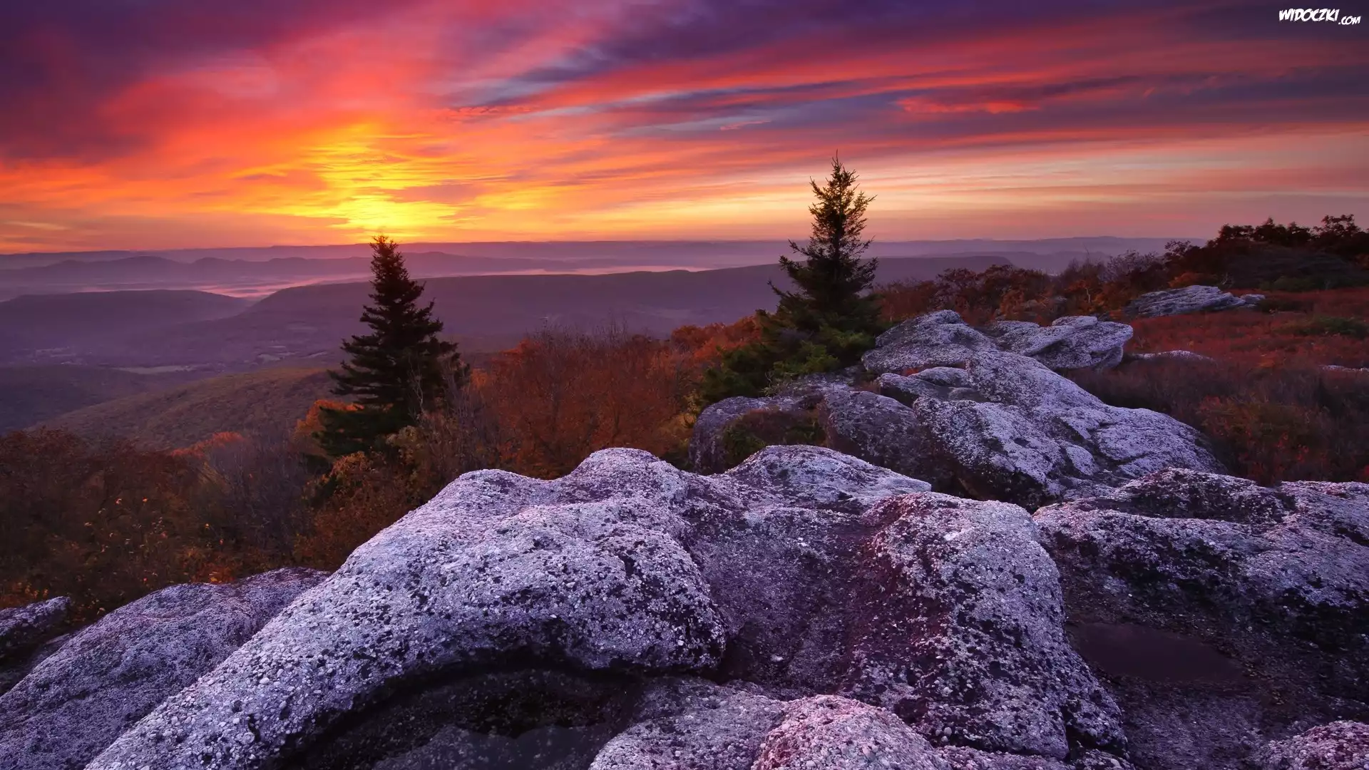 Stany Zjednoczone, Wirginia Zachodnia, Odbszar Dolly Sods Wilderness, Rezerwat przyrody Bear Rocks, Góry, Skały, Drzewa, Zachód słońca |