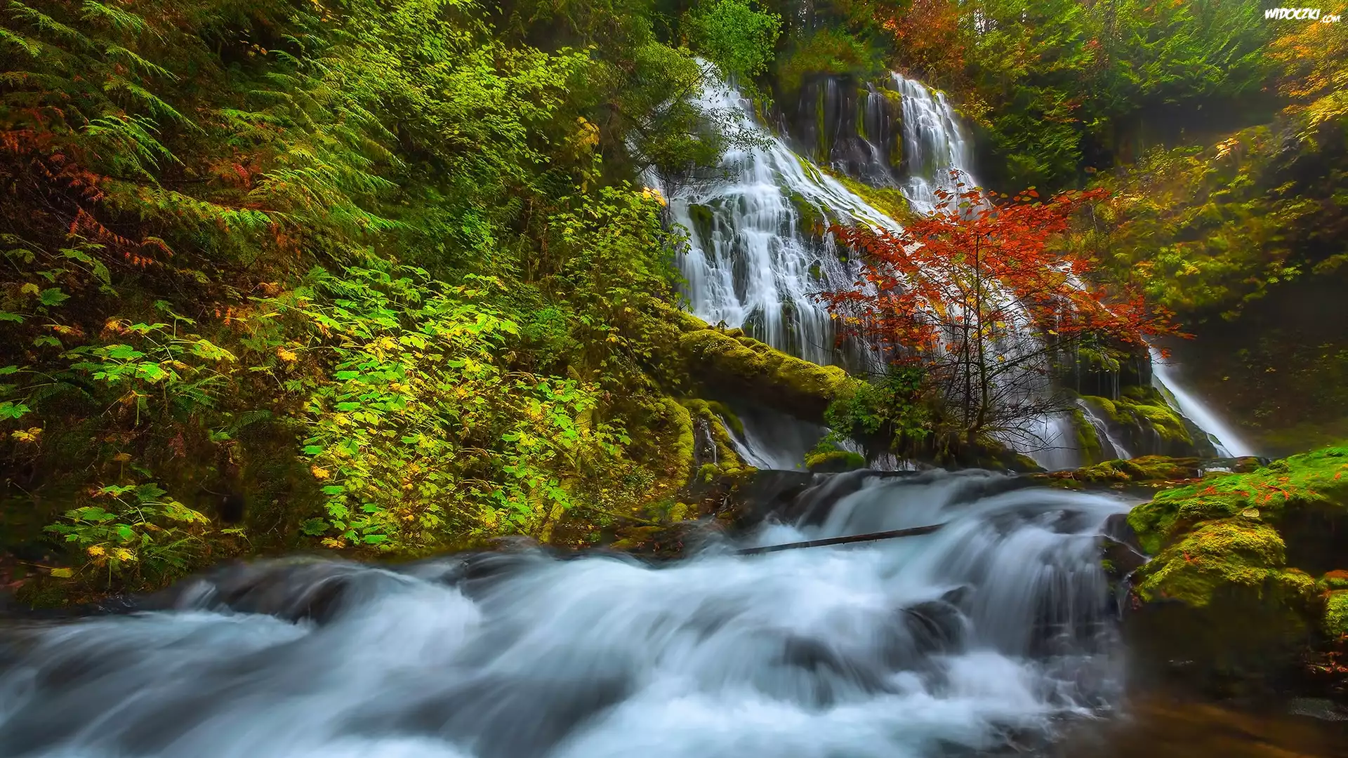 Stany Zjednoczone, Stan Waszyngton, Panther Creek Falls, Wodospad, Las, Rzeka, Drzewa, Miejsce chronione, Gifford Pinchot National Forest |