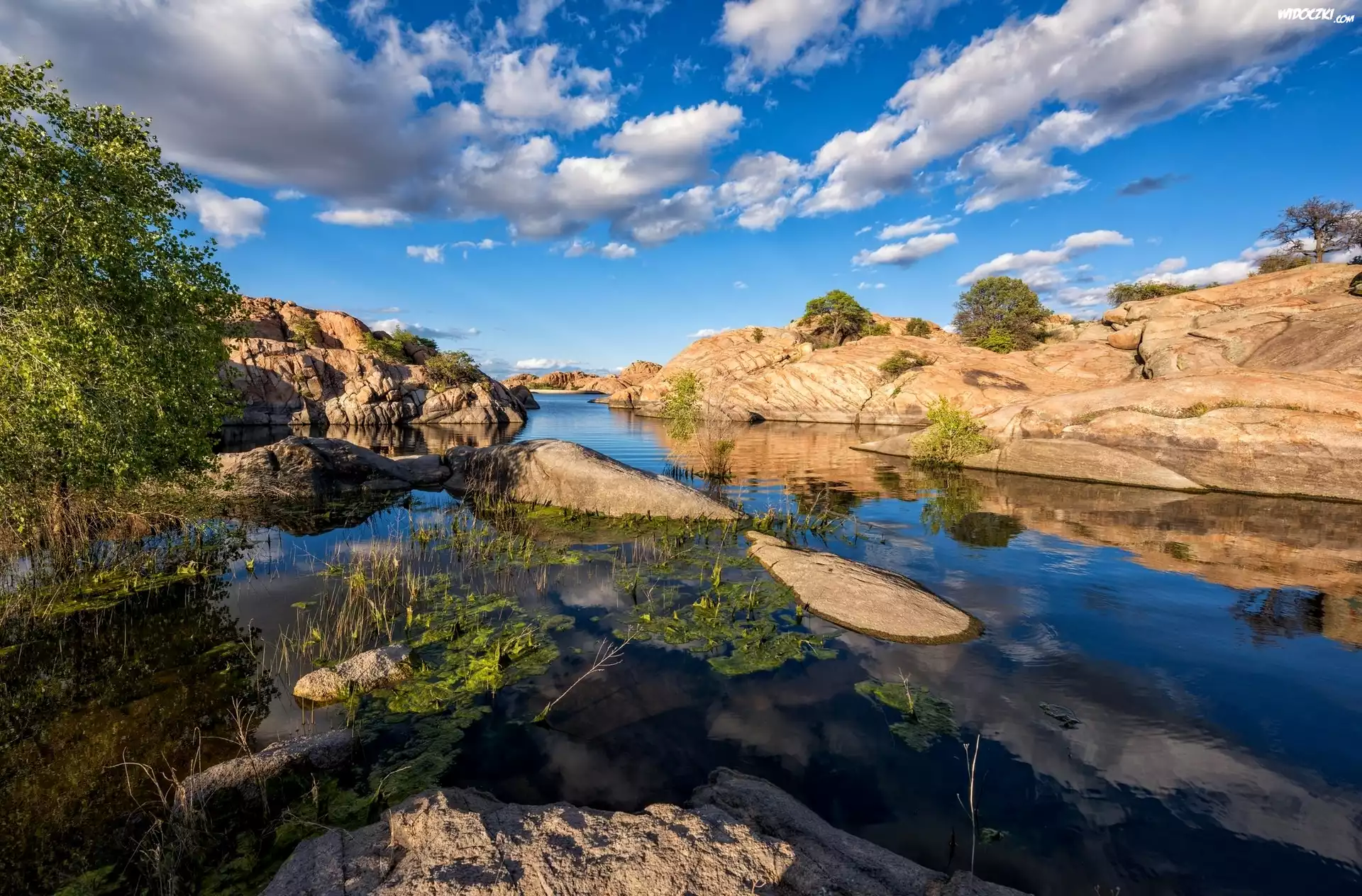 Stany Zjednoczone, Stan Arizona, Formacje skalne Granit Dells, Jezioro Willow Lake, Góry, Skały, Rzeka, Rośliny |