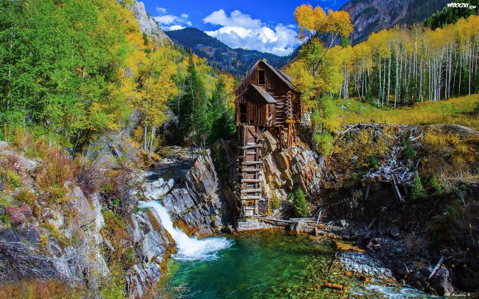 Zdjęcia, Stany Zjednoczone, Kolorado, Młyn, Crystal Mill, Rzeka, Skały, Drzewa