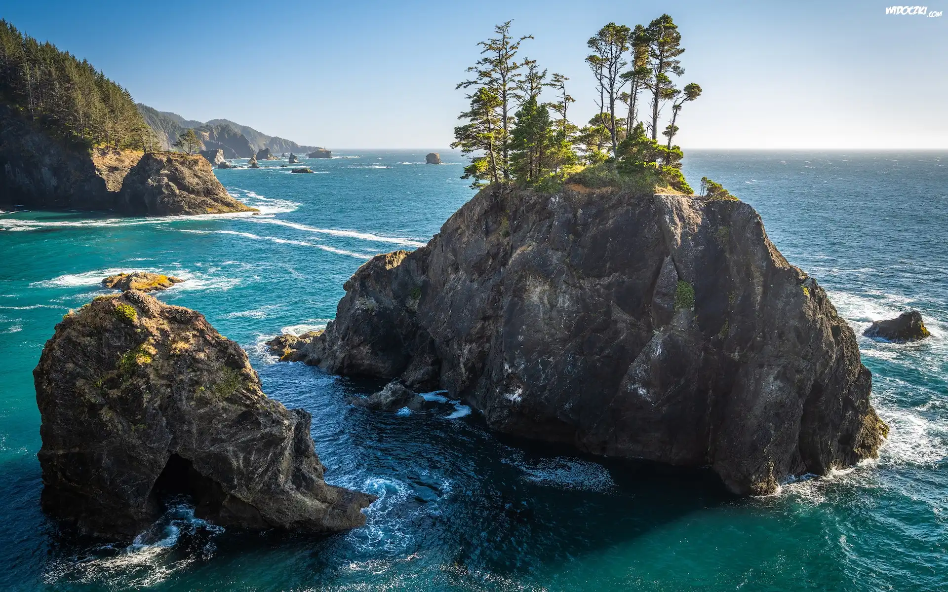 Stany Zjednoczone, Oregon, Morze, Skały, Drzewa, Wysepka, Wybrzeże, Park stanowy, Samuel H. Boardman State Scenic Corridor |