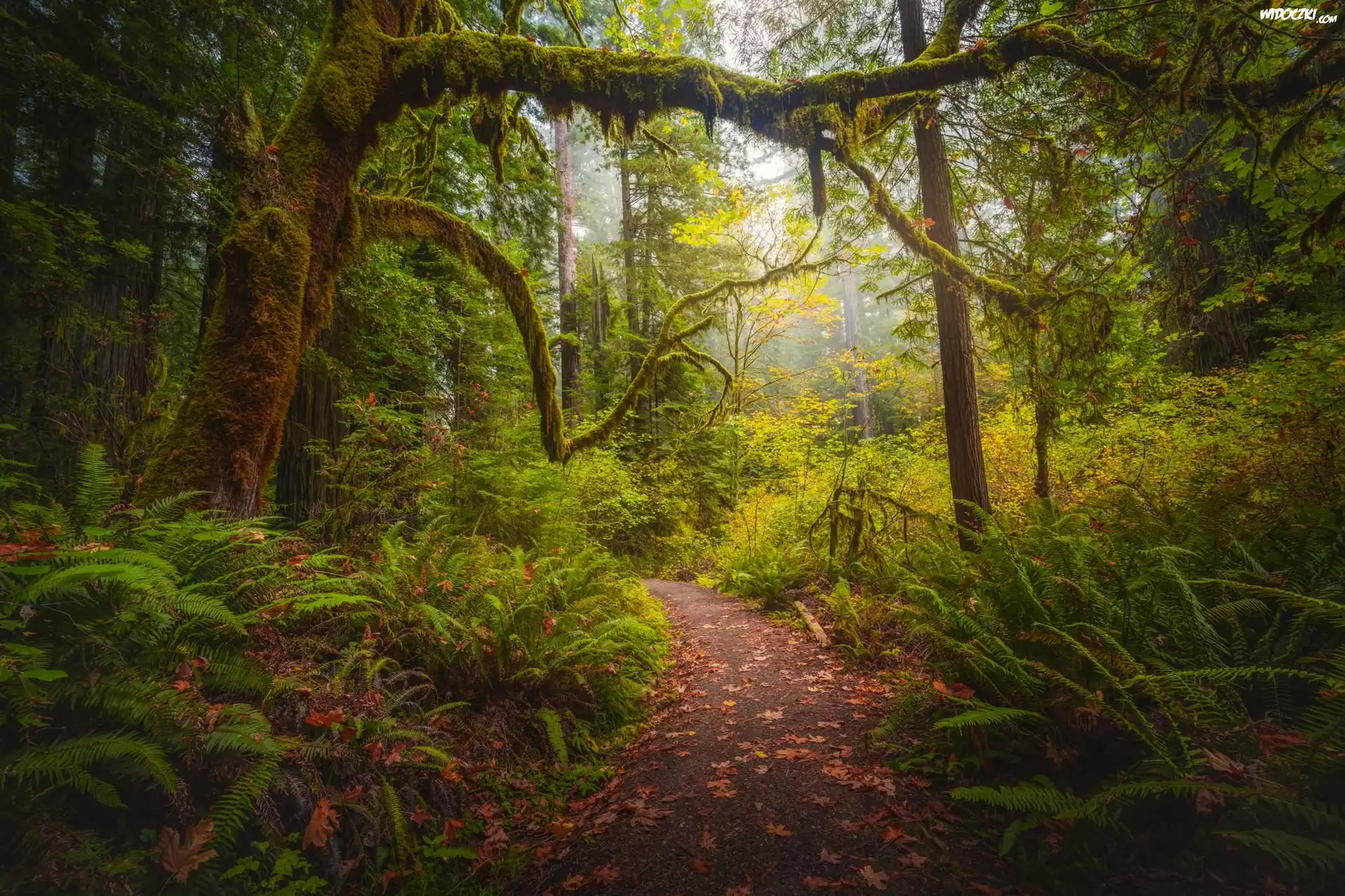 Stany Zjednoczone, Kalifornia, Park Narodowy Redwood, Omszałe, Drzewa, Ścieżka, Paprocie