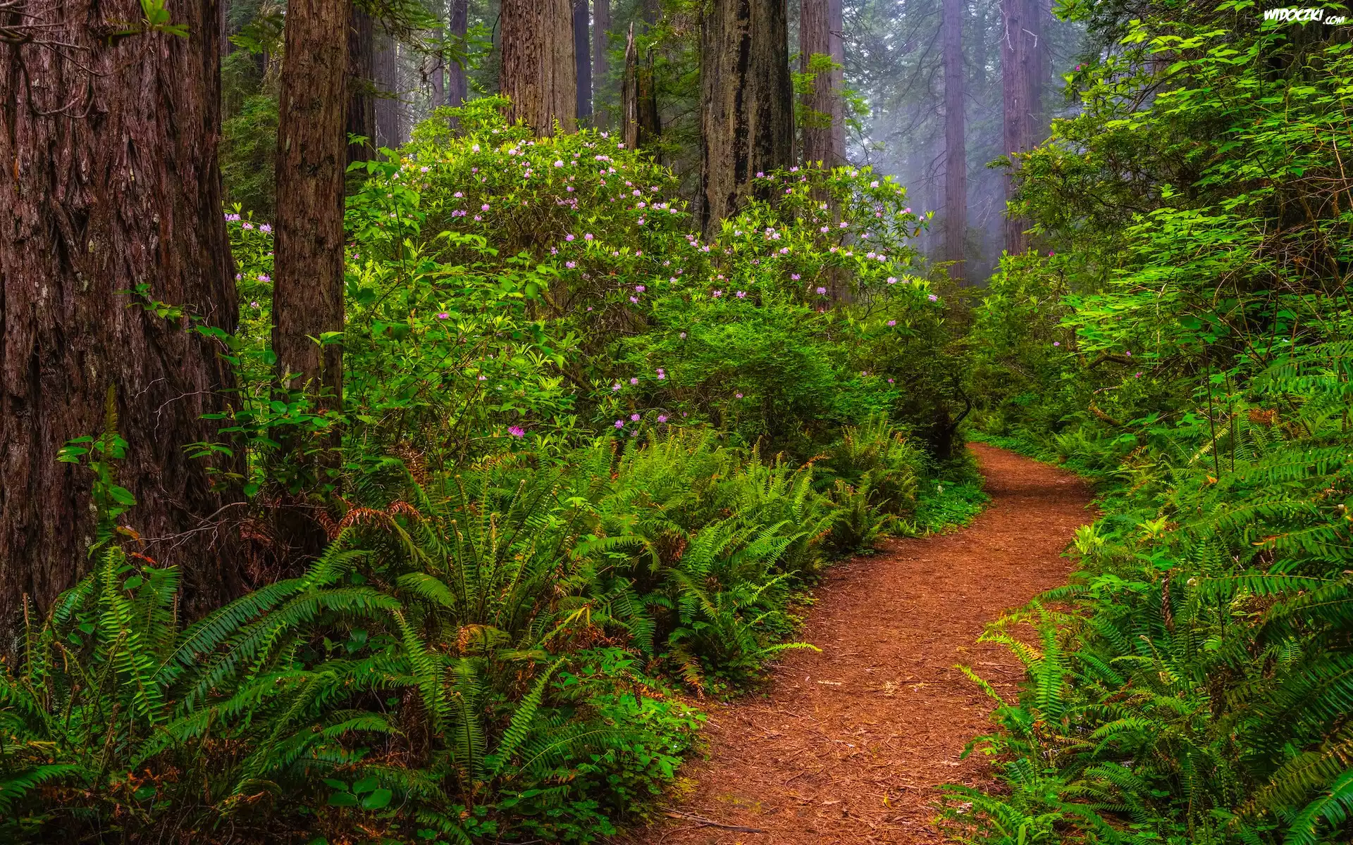 Stany Zjednoczone, Kalifornia, Park Narodowy Redwood, Drzewa, Paprocie, Ścieżka, Rododendrony