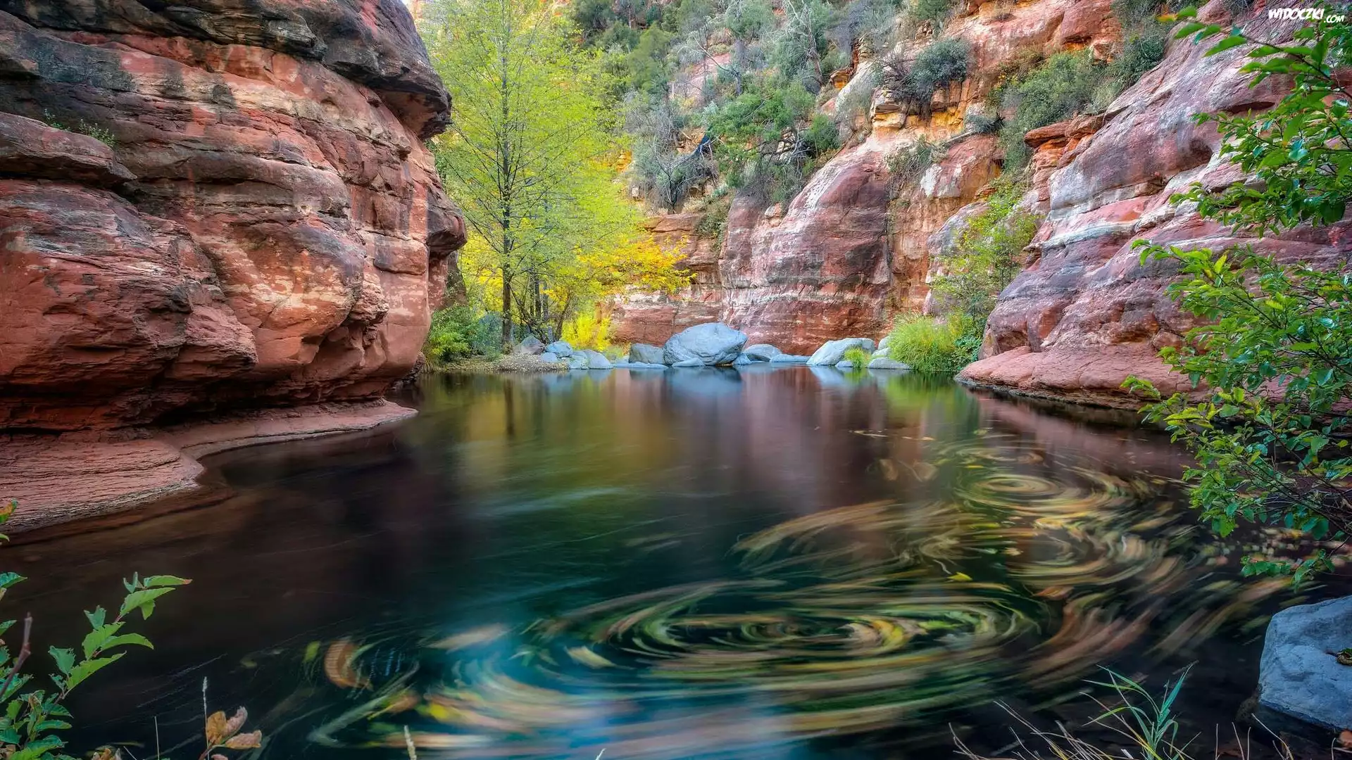 Zdjęcia, Stany Zjednoczone, Arizona, Sedona, Wąwóz Oak Creek Canyon, Rzeka Oak Creek, Skały, Drzewa
