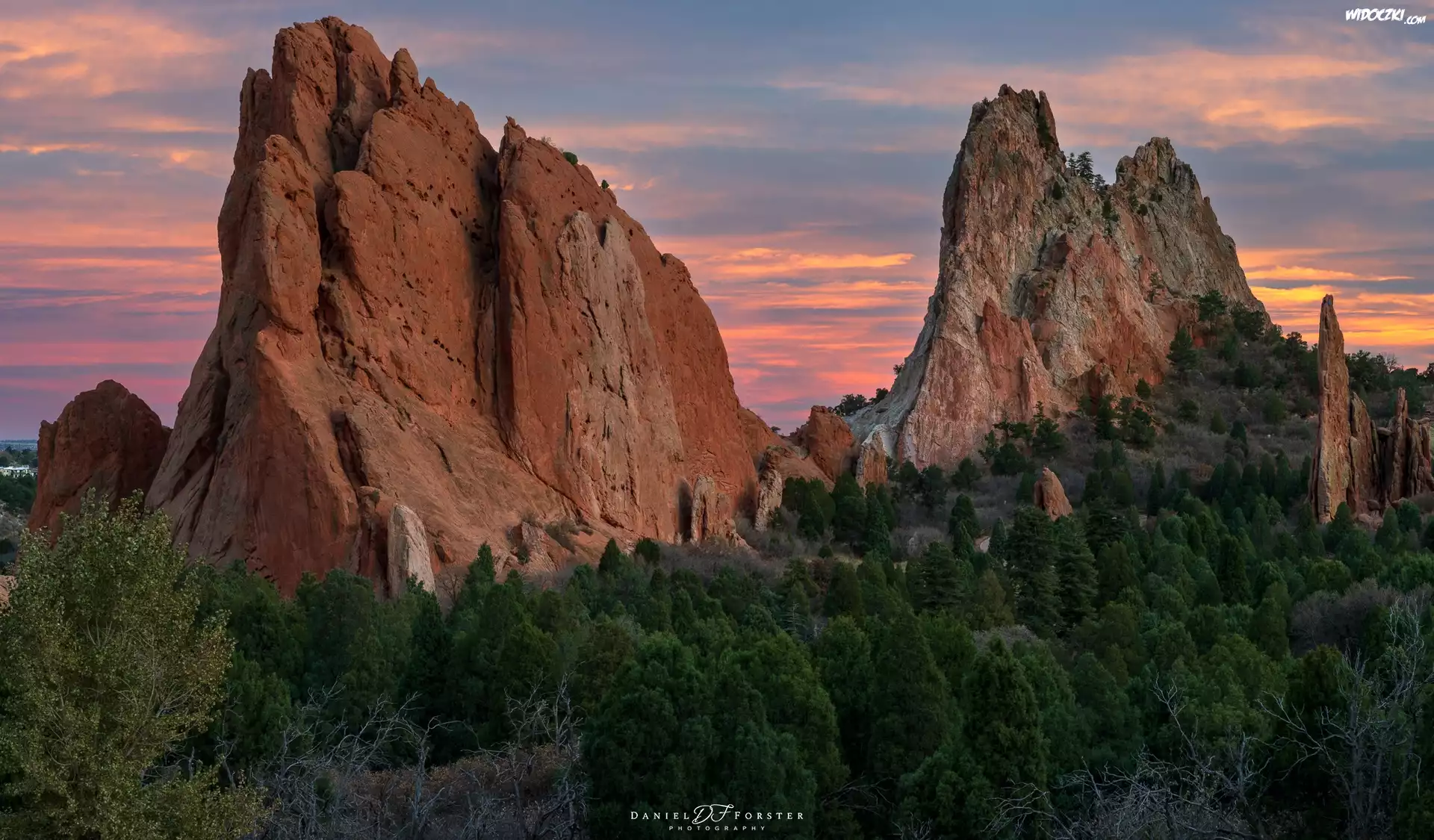 Zdjęcia, Stany Zjednoczone, Kolorado, Garden of the Gods, Góry, Skały, Drzewa