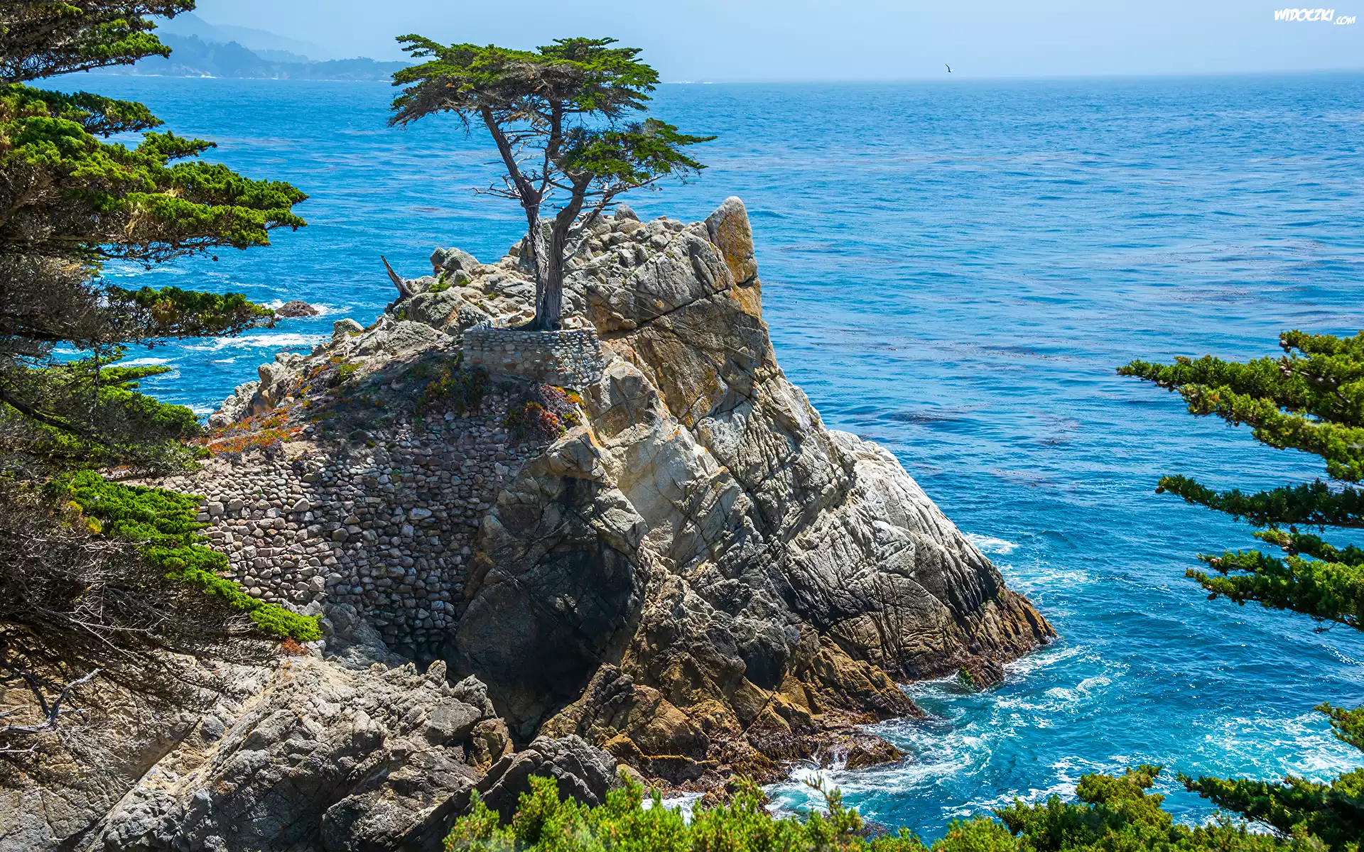 Zdjęcia, Stany Zjednoczone, Stan Kalifornia, Pebble Beach, Ocean, Wybrzeże, Skały, Drzewa