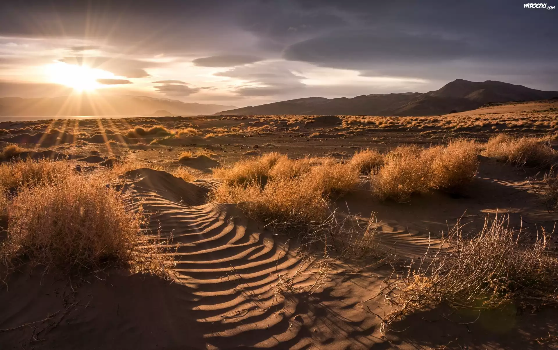 Stany Zjednoczone, Stan Nevada, Great Salt Lake Desert, Wielka Pustynia Słona, Wschód, Promienie słońca, Trawa |