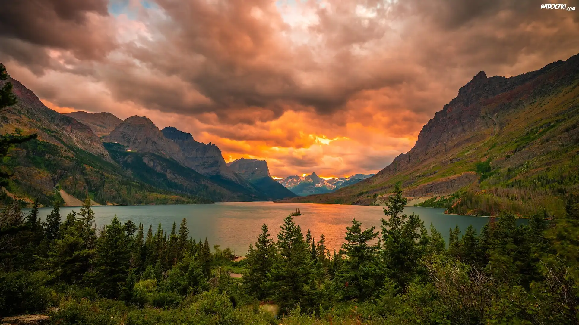 Zdjęcia, Stany Zjednoczone, Stan Montana, Park Narodowy Glacier, Drzewa, Góry, Jezioro, Saint Mary Lake, Zachód słońca, Chmury