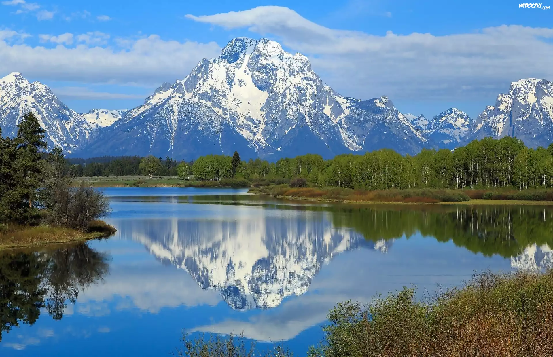 Stany Zjednoczone, Stan Wyoming, Park Narodowy Grand Teton, Rzeka Snake River, Góry, Szczyt Mount Moran, Drzewa, Odbicie |