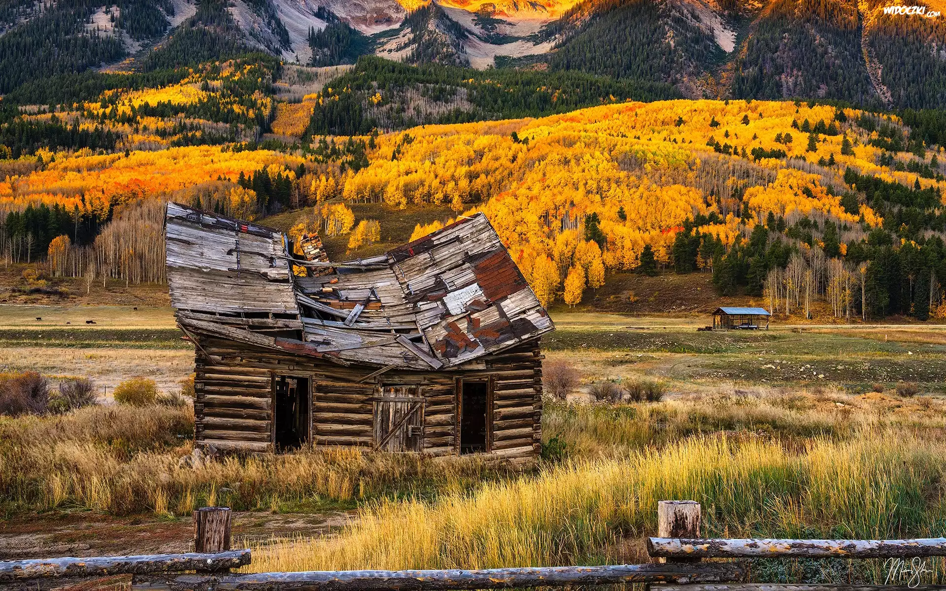 Zdjęcia, Stany Zjednoczone, Kolorado, Crested Butte, Góry, Jesień, Drzewa, Szopa, Drewniana