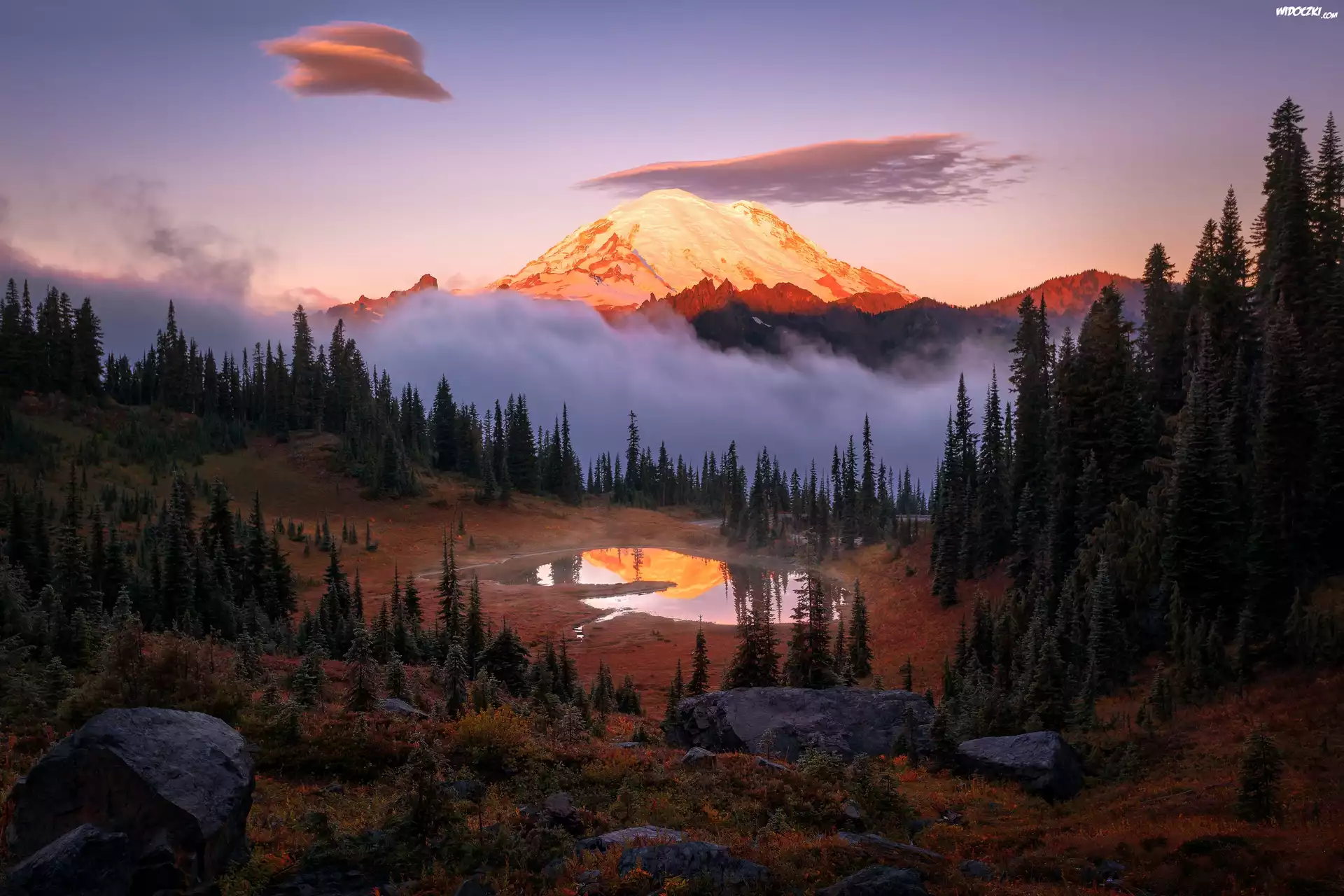 Stany Zjednoczone, Stan Waszyngton, Park Narodowy Mount Rainier, Góry, Stratowulkan Mount Rainier, Drzewa, Jezioro Tipsoo, Mgła |