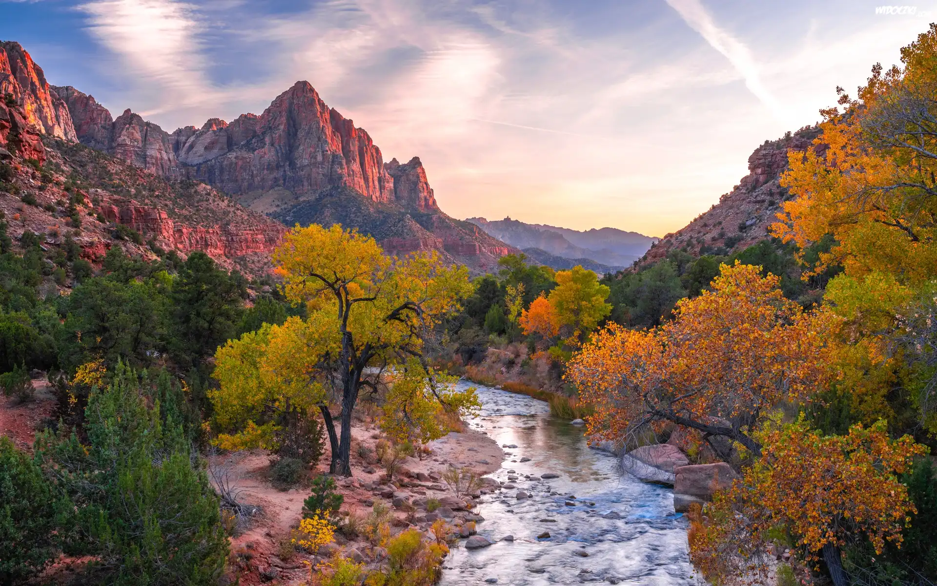 Stany Zjednoczone, Stan Utah, Park Narodowy Zion, Góry Watchman, Rzeka, Virgin River, Kamienie, Drzewa, Wschód słońca |
