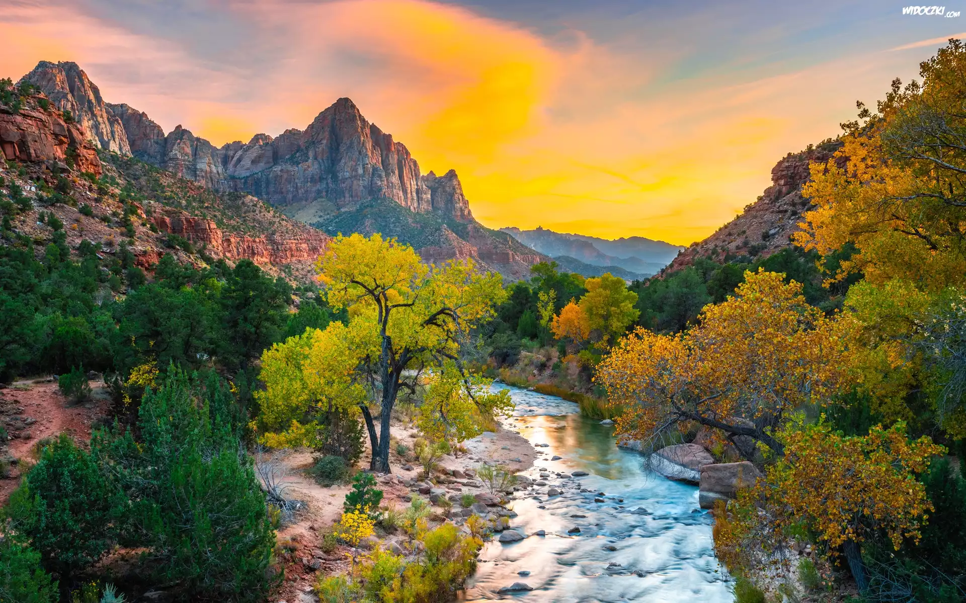 Stany Zjednoczone, Stan Utah, Park Narodowy Zion, Góry Watchman, Rzeka Virgin River, Kamienie, Drzewa, Wschód słońca |