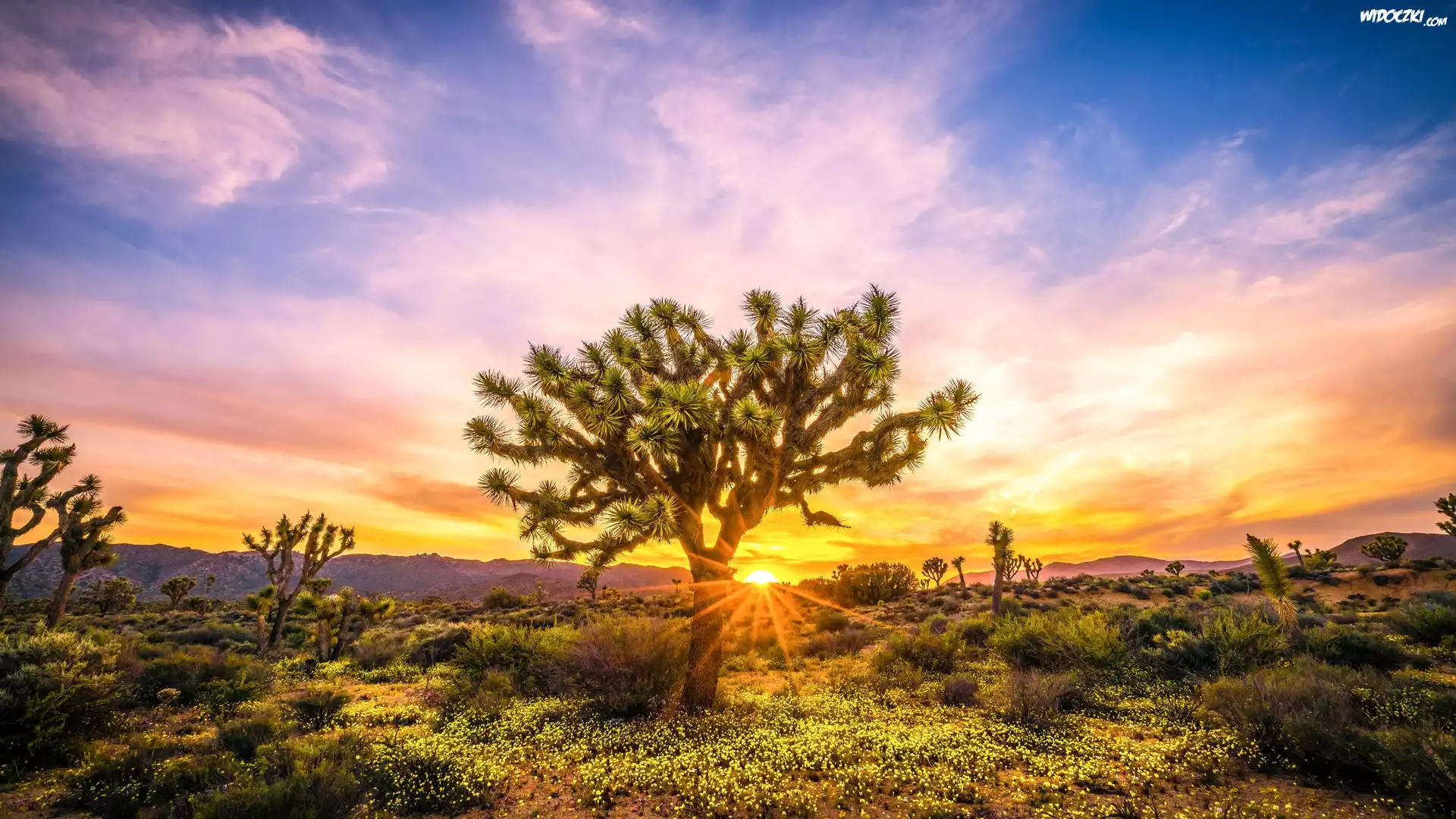 Stany Zjednoczone, Stan Kalifornia, Park Narodowy Joshua Tree, Jukki krótkolistne, Drzewo Jozuego, Roślinność, Wschód słońca |