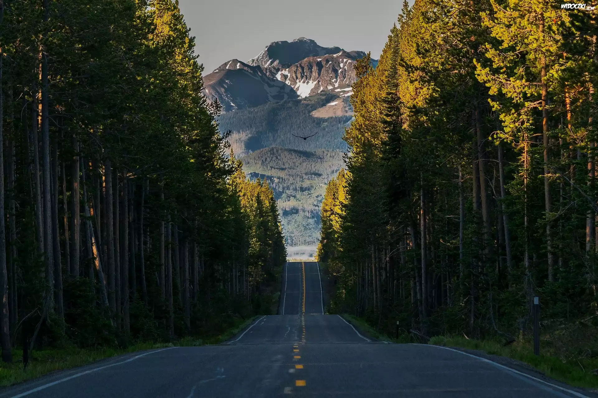 Stany Zjednoczone, Stan Wyoming, Park Narodowy Yellowstone, Grand Teton, Góry, Szczyt Grand Teton, Droga South Entrance Road, Las, Ptak |