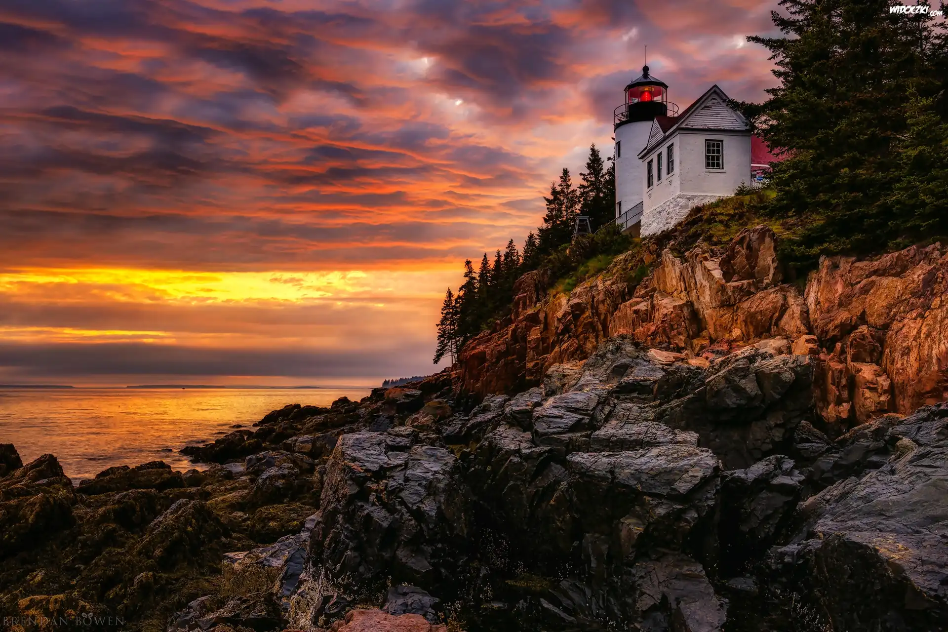 Stany Zjednoczone, Stan Maine, Park Narodowy Acadia, Bass Harbor, Latarnia morska, Morze, Skały, Zachód słońca |