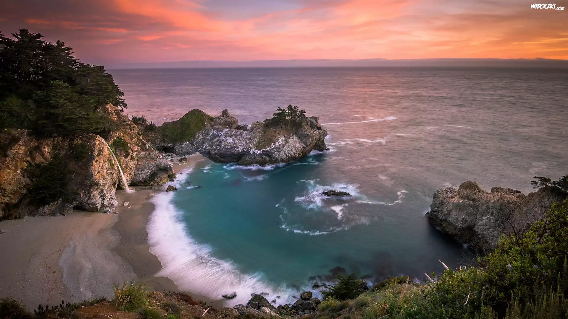 Stany Zjednoczone, Kalifornia, Park stanowy Julii Pfeiffer Burns, Morze, Zatoka, Wodospad McWay Falls, Skały, Zachód słońca |