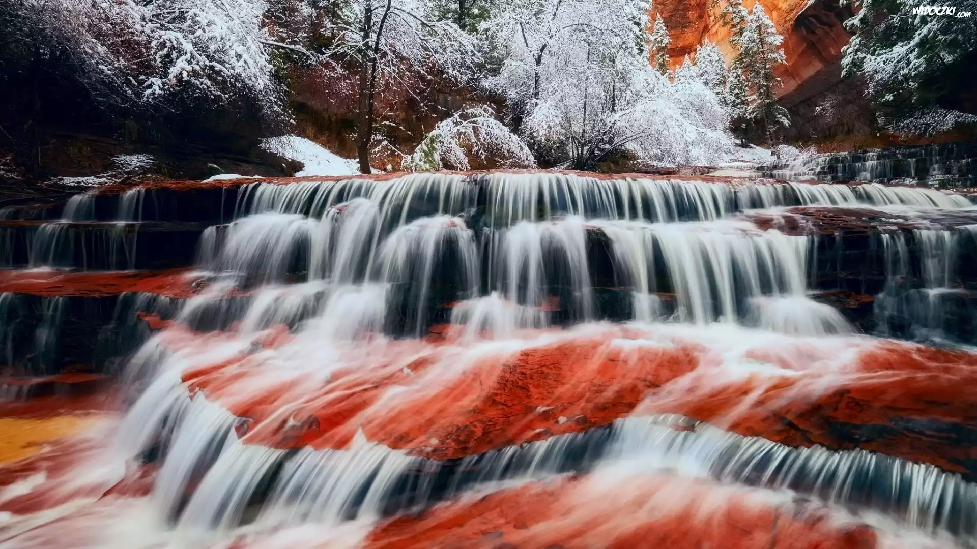 Stany Zjednoczone, Stan Utah, Park Narodowy Zion, Kanion, Wodospad Archangel Falls, Rzeka, Drzewa, Zima, Śnieg |