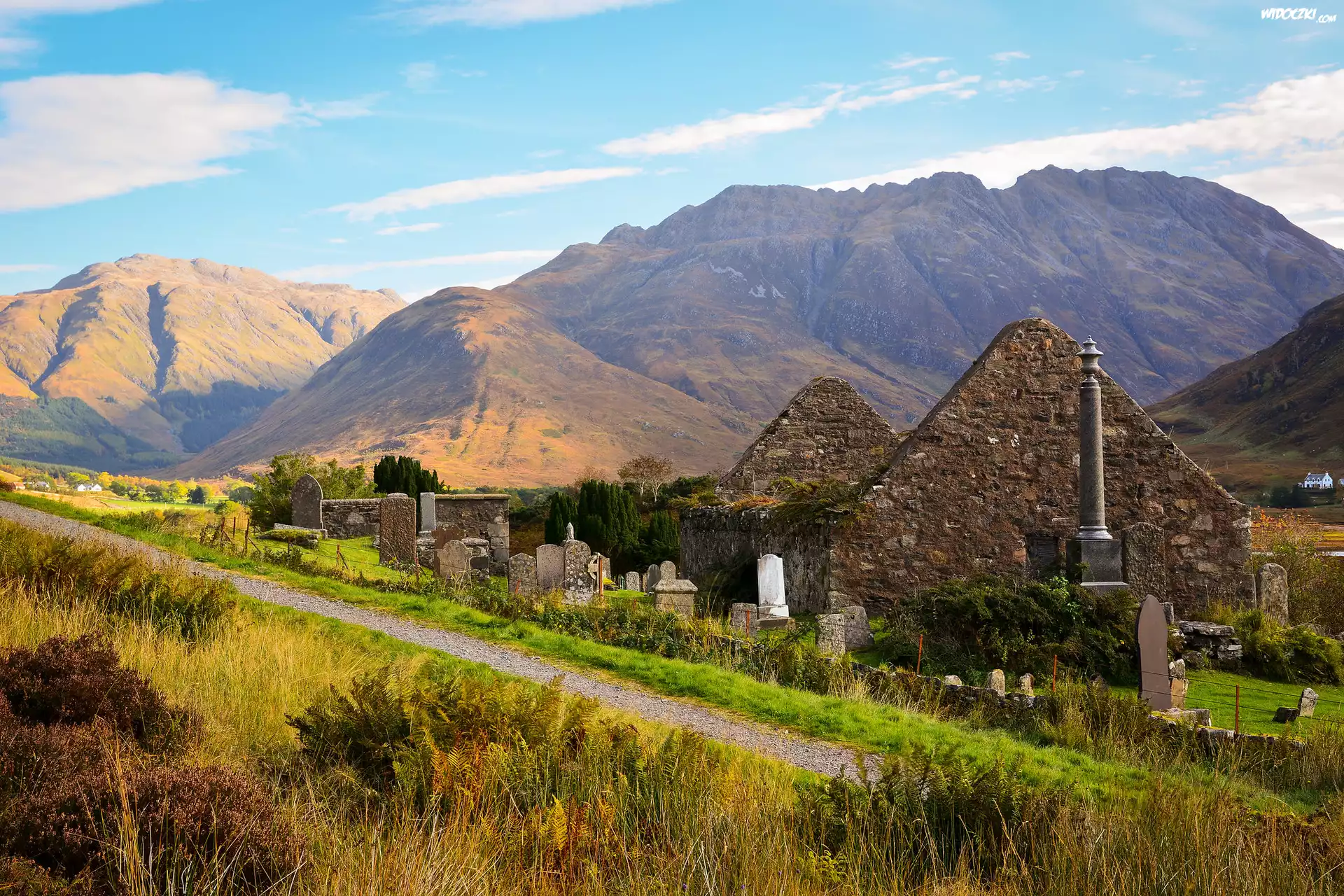 Starożytny, Kościół, Clachan Duich, Cmentarz, Trawa, Ścieżka, Góry, Kyle, Szkocja