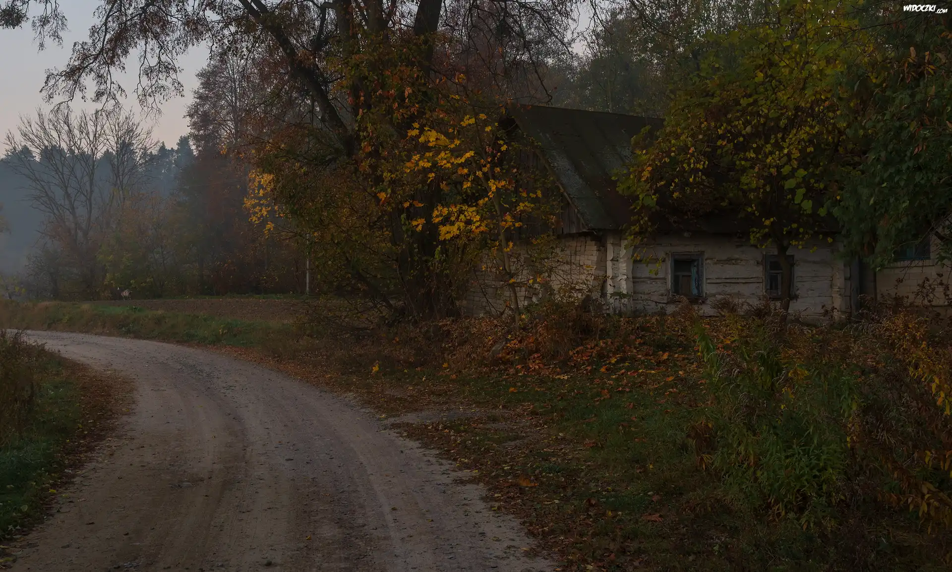 Zdjęcia, Stary, Drewniany, Domek, Droga, Drzewa, Jesień