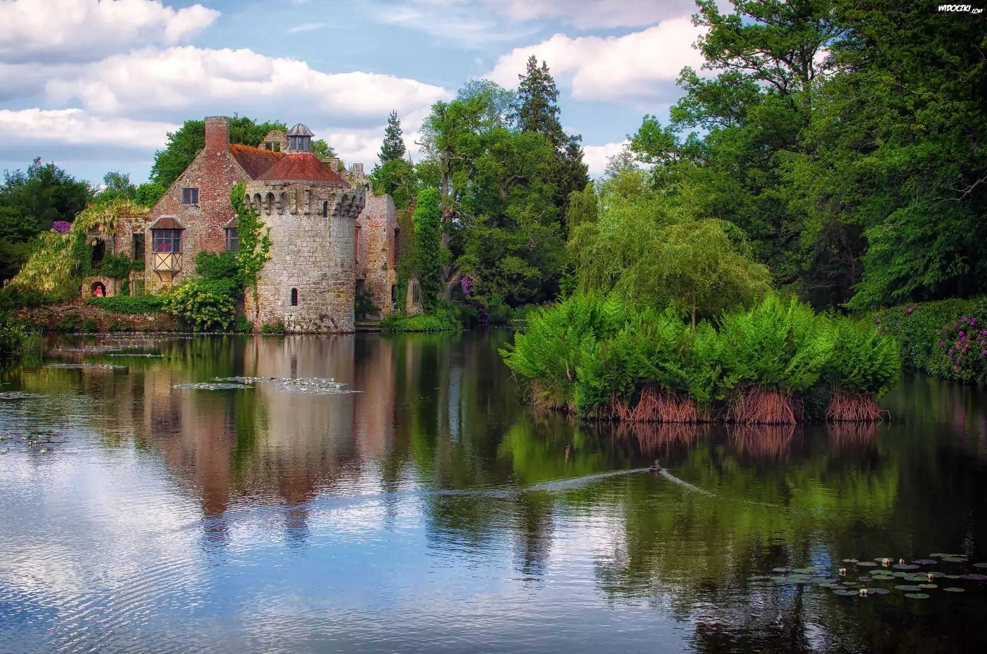 Zdjęcia, Zamek Scotney, Scotney Castle, Wieś Lamberhusrt, Hrabstwo Kent, Anglia, Jezioro